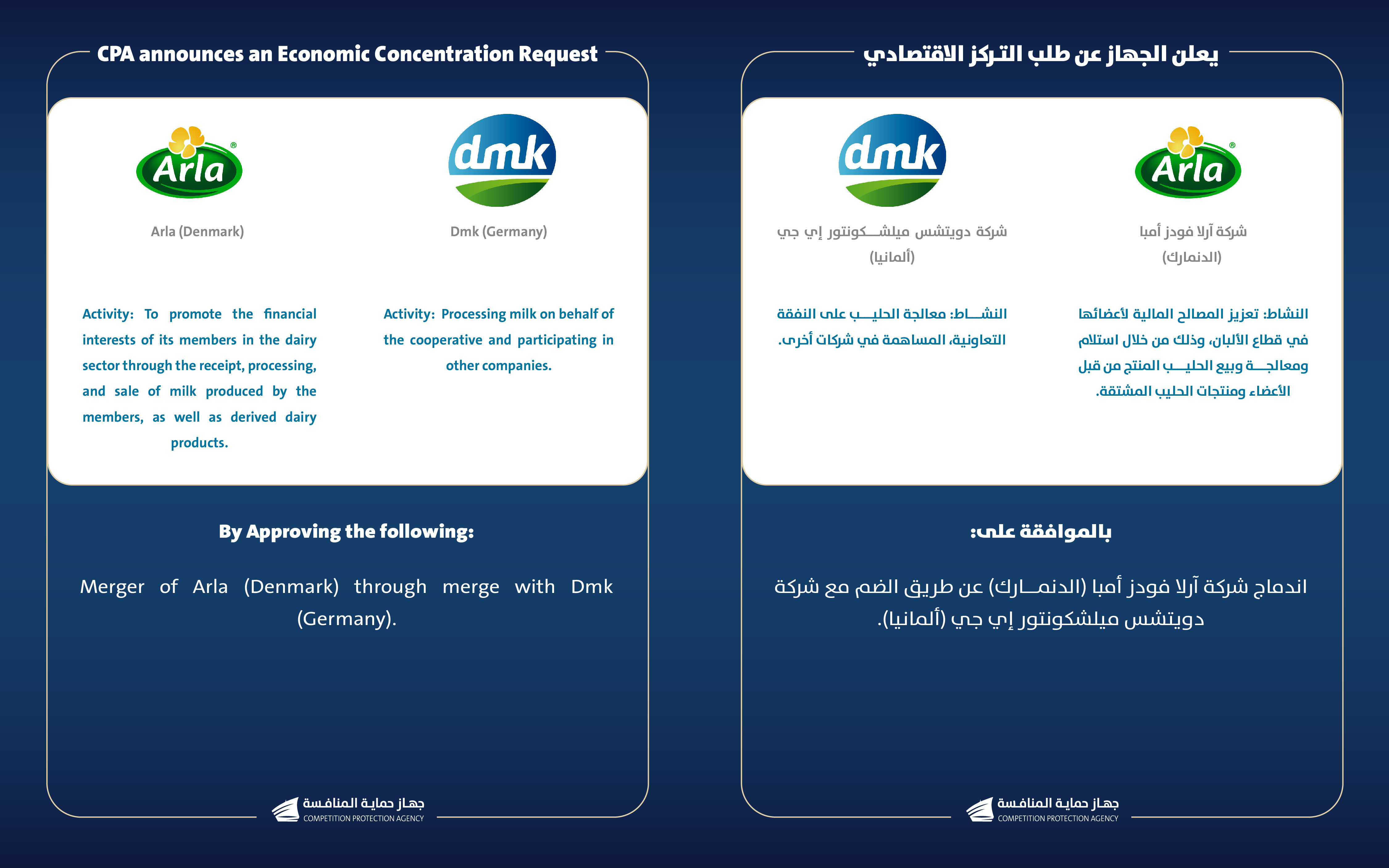 تقدم شركة آرلا فودز أمبا (الدنمارك) وشركة دويتشس ميلشكونتور إي جي (ألمانيا) بطلب الموافقة