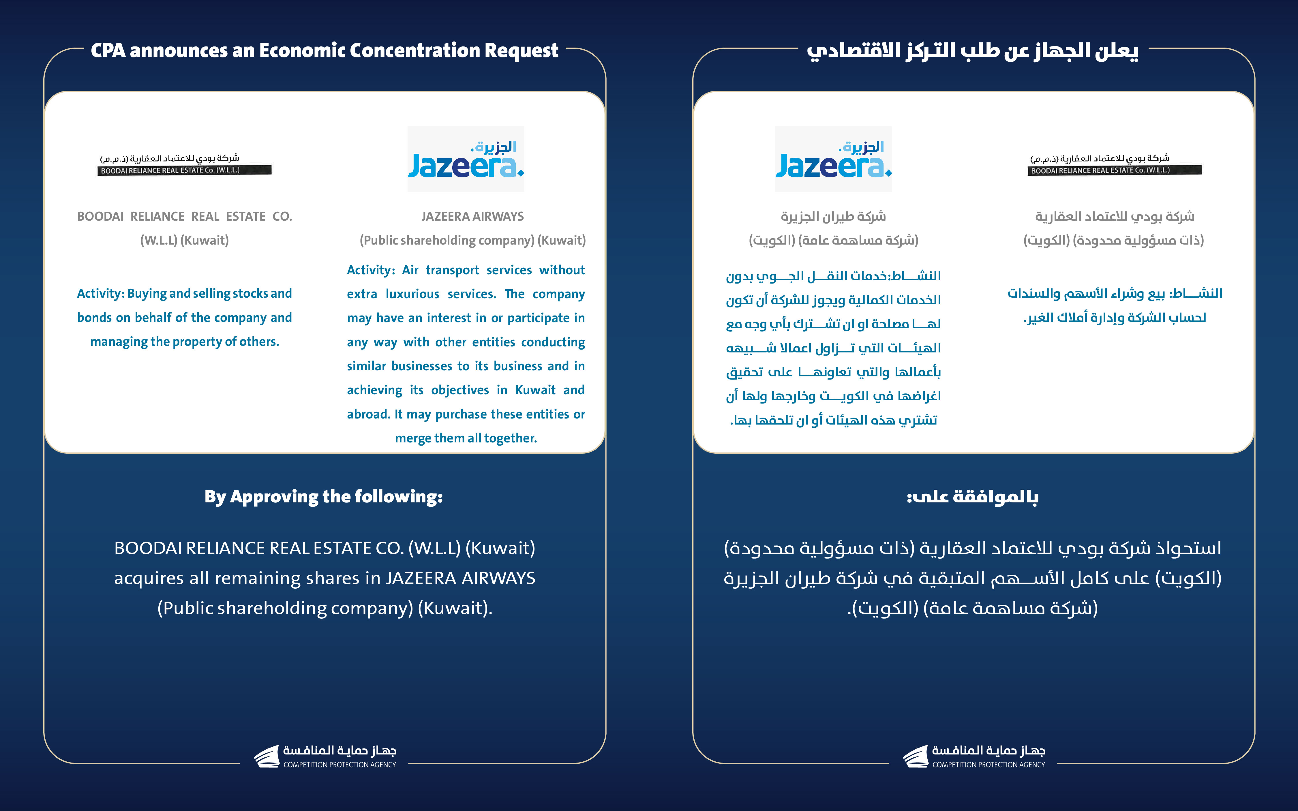 تقدم شركة بودي للاعتماد العقارية (ذات مسؤولية محدودة) (الكويت) وشركة طيران الجزيرة (شركة مساهمة عامة) (الكويت) بطلب الموافقة على اتمام عملية التركز الاقتصادي.