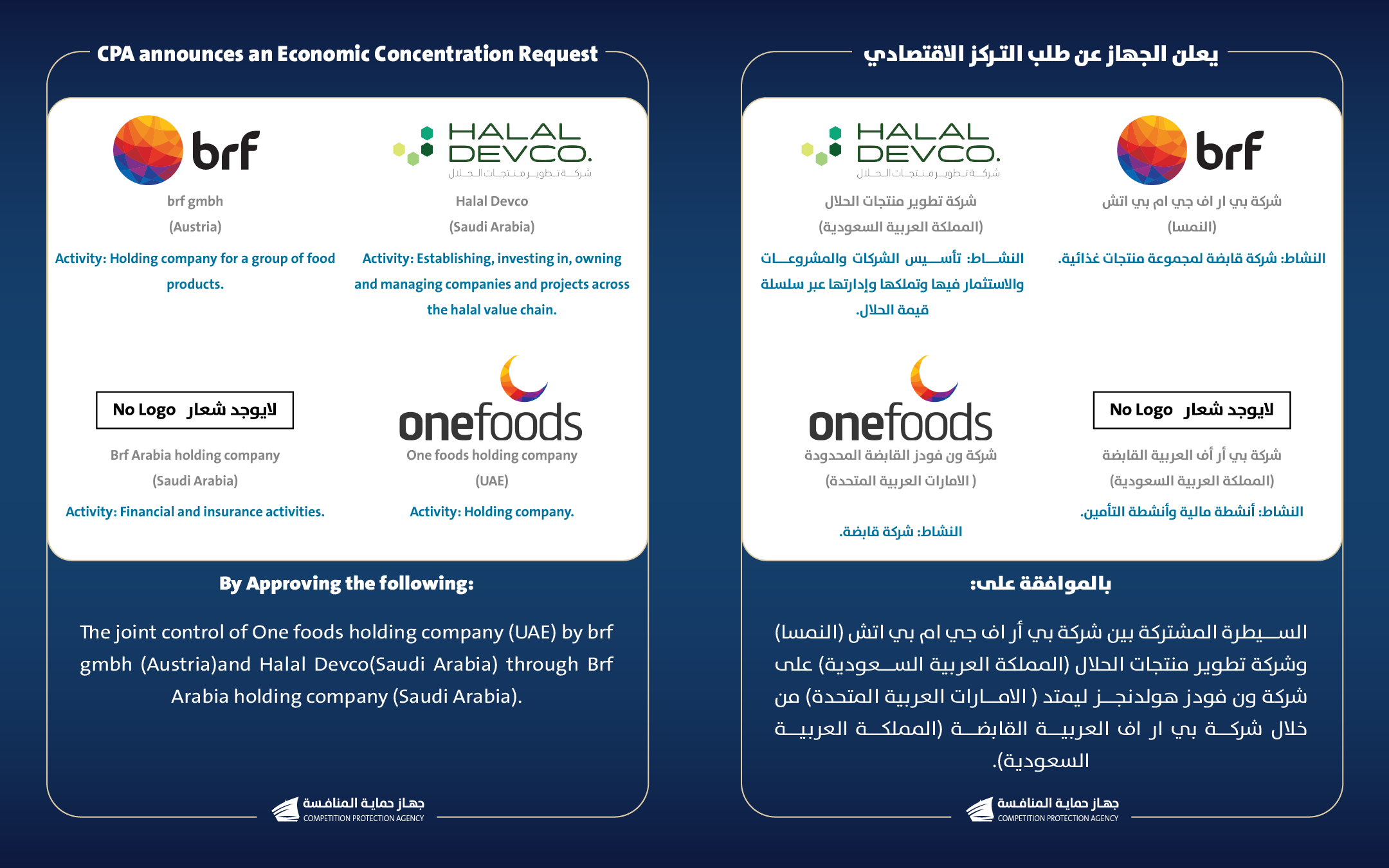 تقدم شركة بي ار اف جي ام بي اتش (النمسا) وشركة تطوير منتجات الحلال (المملكة العربية السعودية) وشركة بي أر أف العربية القابضة (المملكة العربية السعودية) وشركة ون فودز القابضة المحدودة (الامارات العربية المتحدة) بطلب الموافقة على اتمام عملية التركز الاقتصادي.