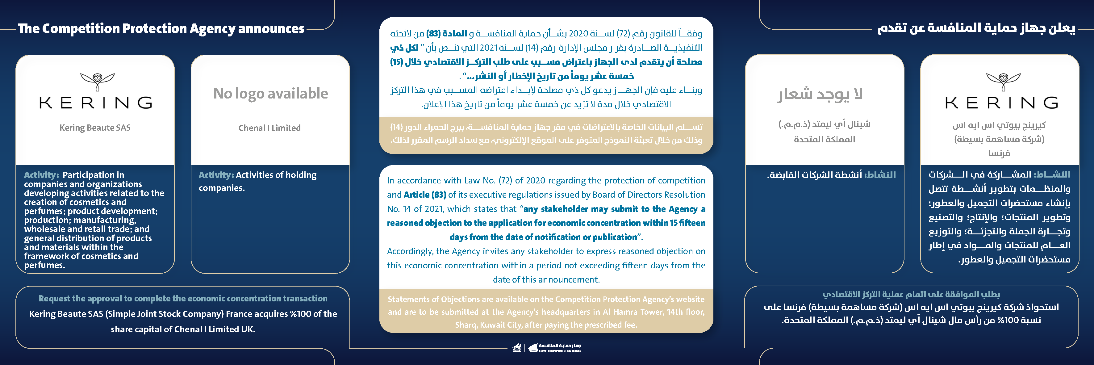 علن جهاز حماية المنافسة عن تقدم شركة كيرينج بيوتي اس ايه اس (شركة مساهمة بسيطة) فرنسا وشرك