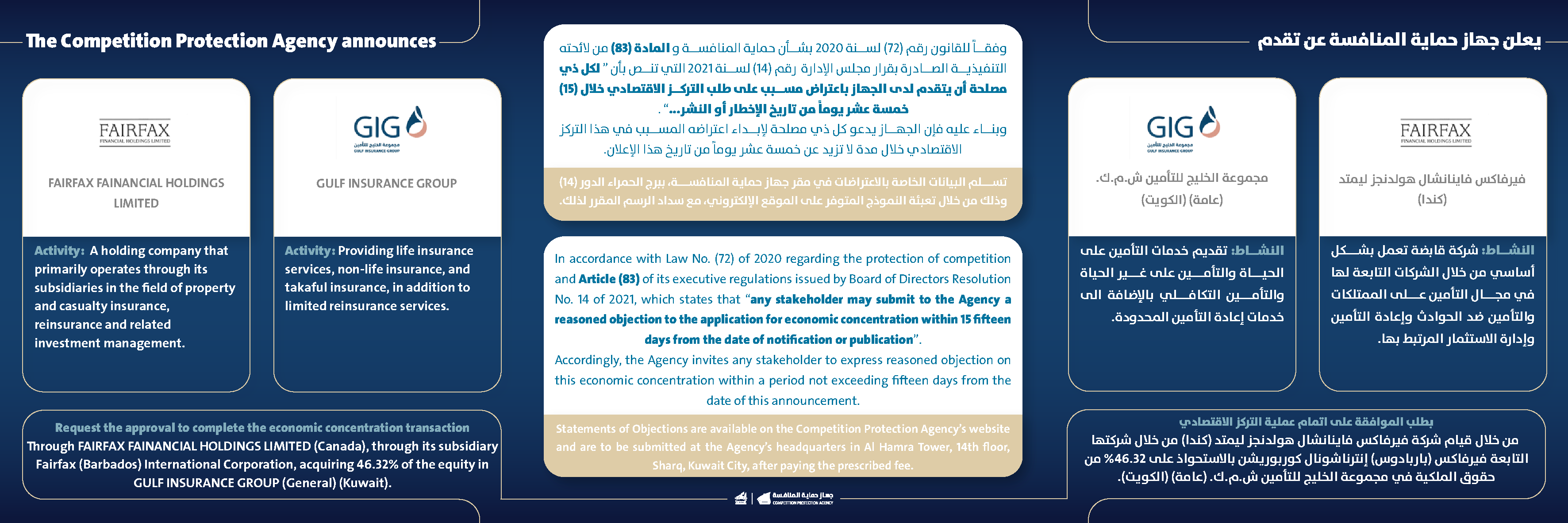يعلن جهاز حماية المنافسة عن تقدم شركة فيرفاكس فاينانشال هولدنجز ليمتد (كندا) وشركة مجموعة