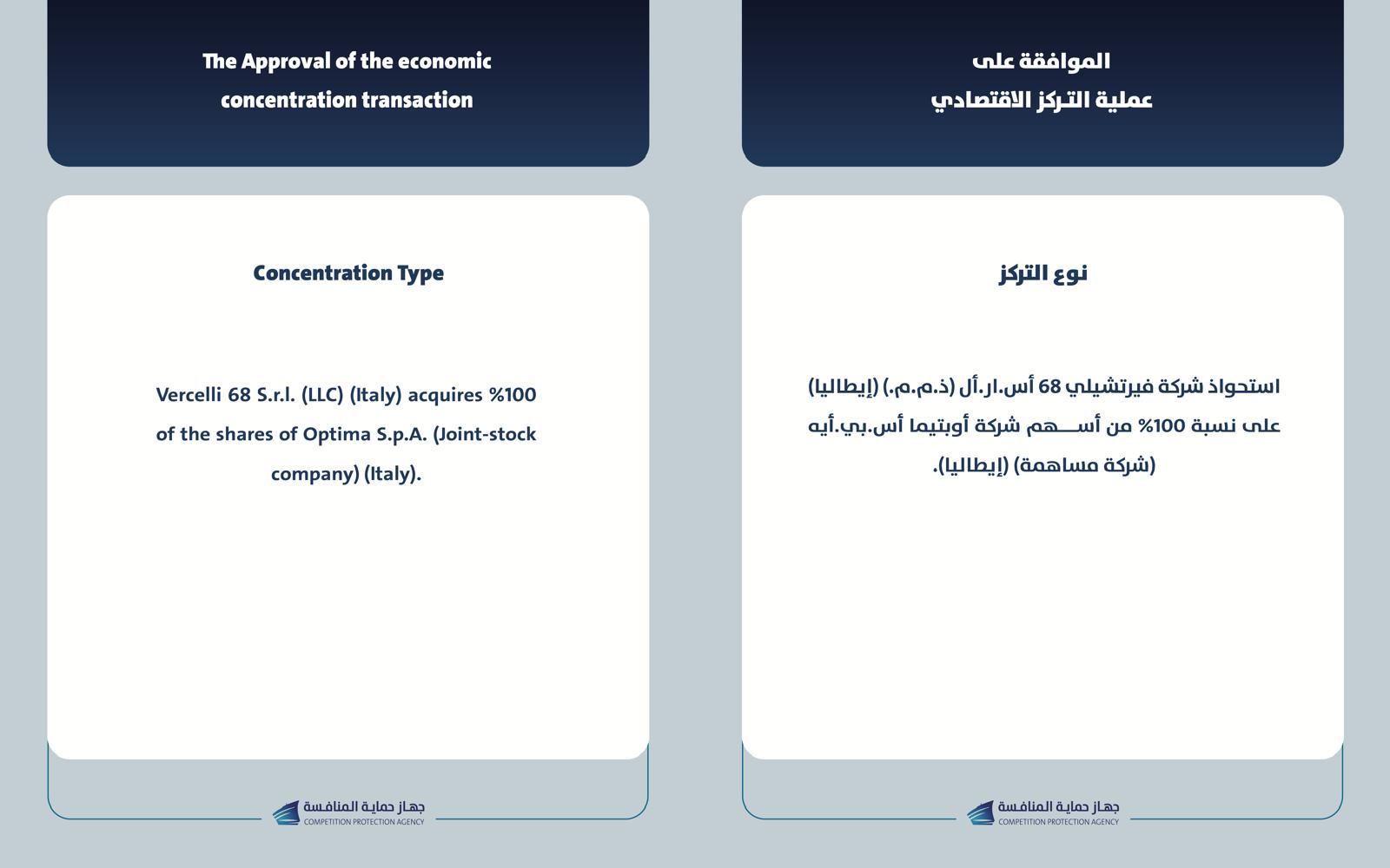 الموافقة على عملية التركز الاقتصادي بين شركة فيرتشيلي 68 أس . ار.أل( ذ.م.م.)(إيطاليا) وشرك