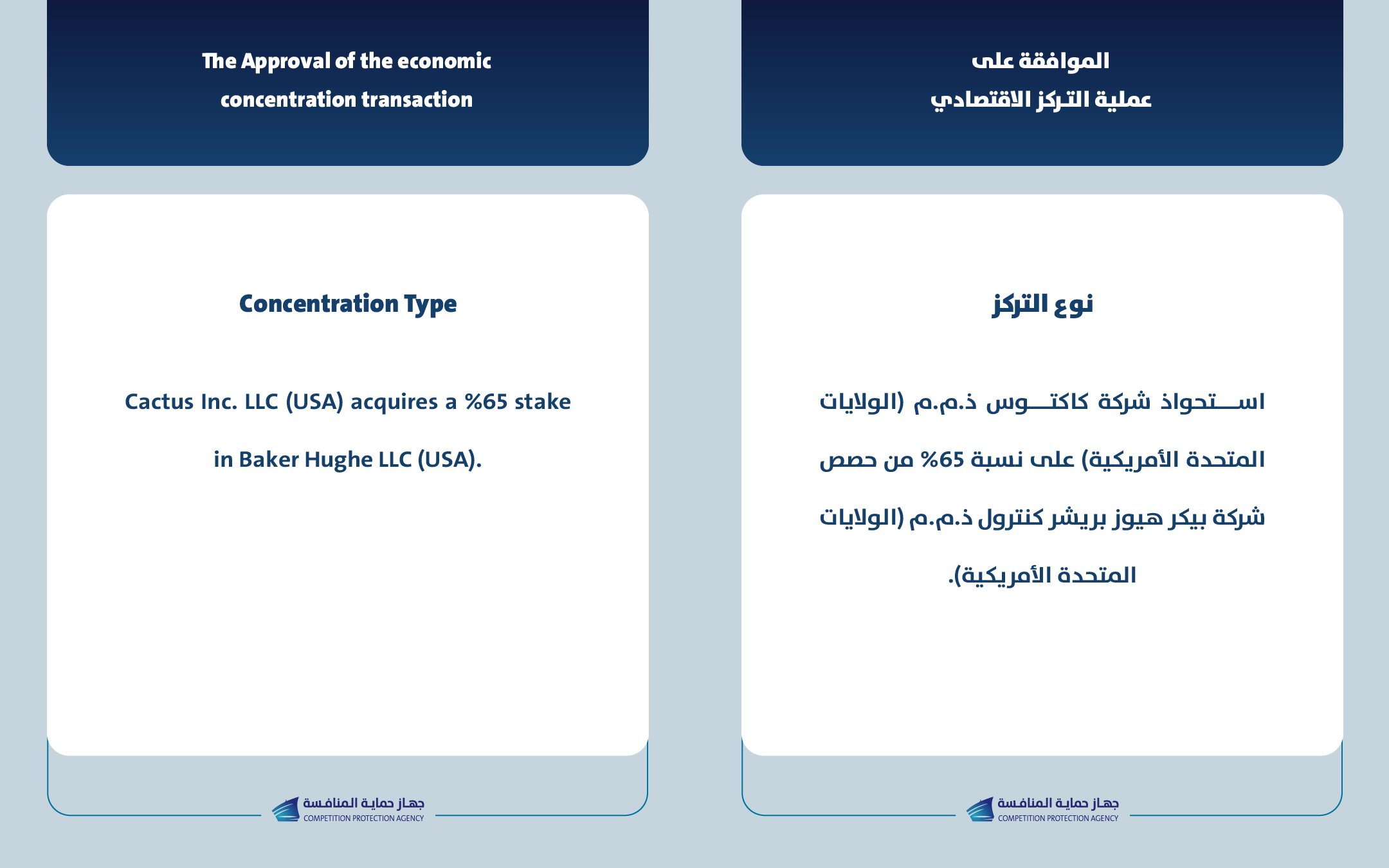 الموافقة على عملية التركز الاقتصادي بين شركة كاكتوس ذ.م.م(الولايات المتحدة الأمريكية) وشرك