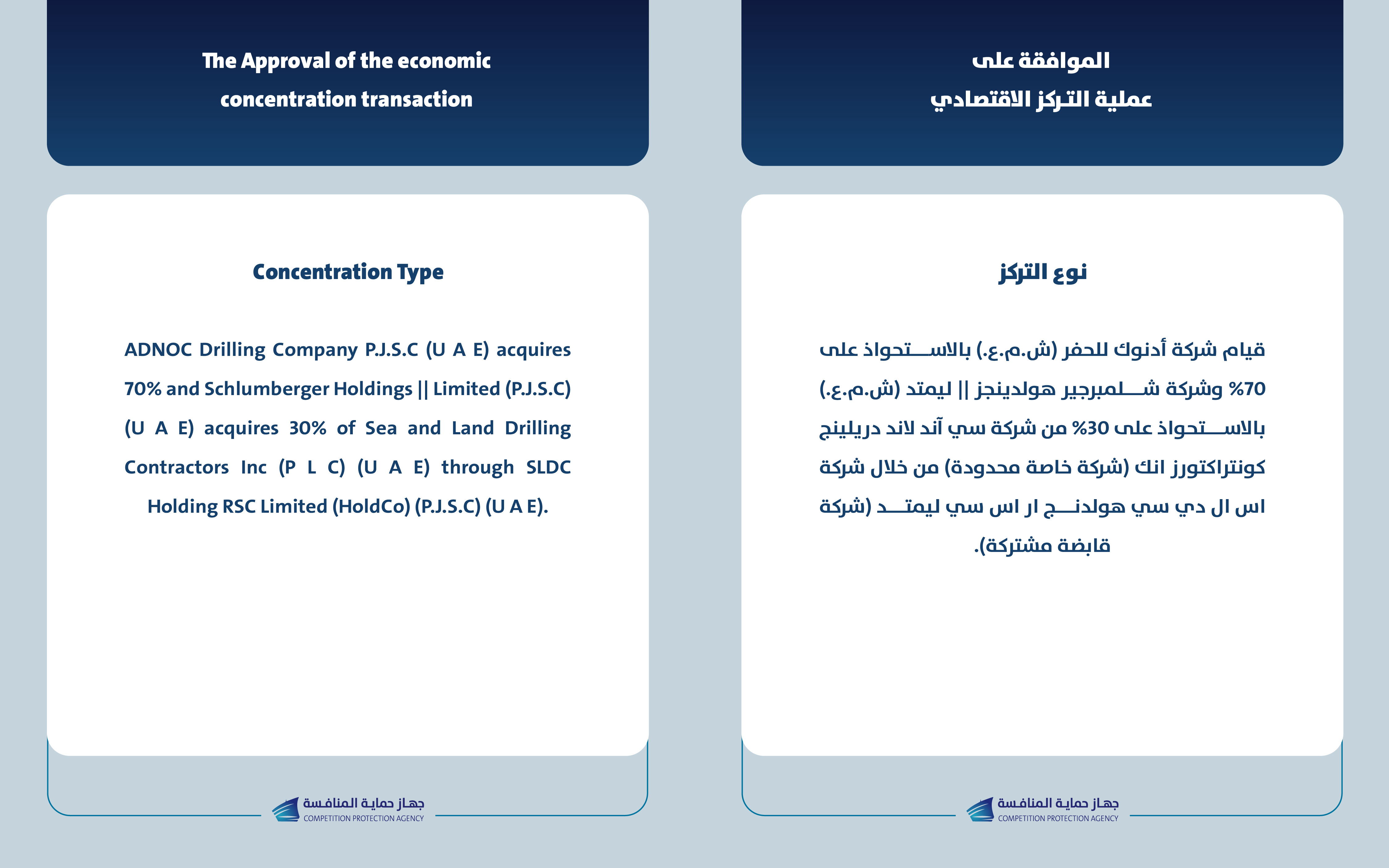 يعلن جهاز حماية المنافسة عن الموافقة لإتمام عملية التركز الاقتصادي بين شركة أدنوك للحفر (ش