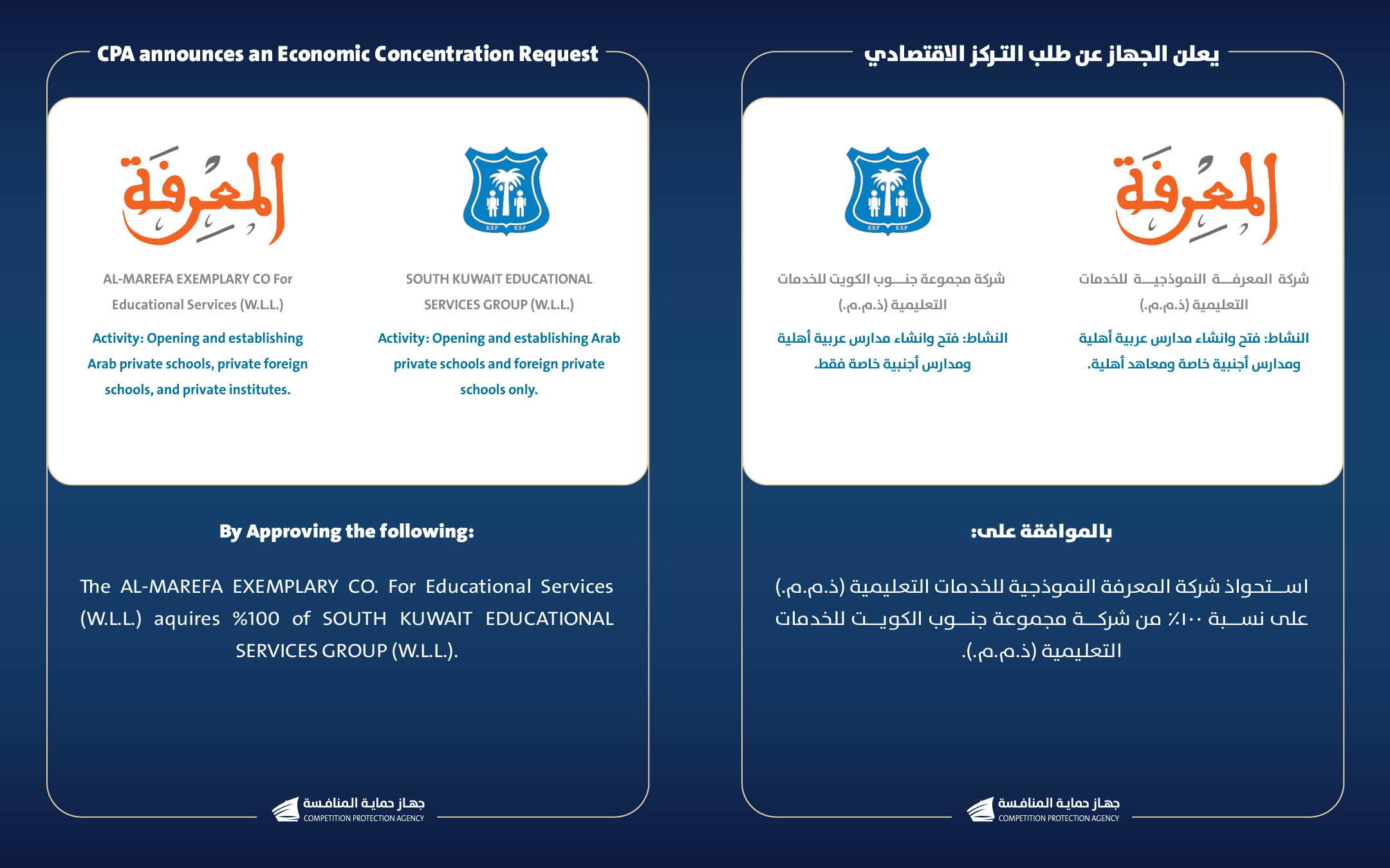 يعلن جهاز حماية المنافسة عن تقدم شركة المعرفة النموذجية للخدمات التعليمية (ذ.م.م. (وشركة م