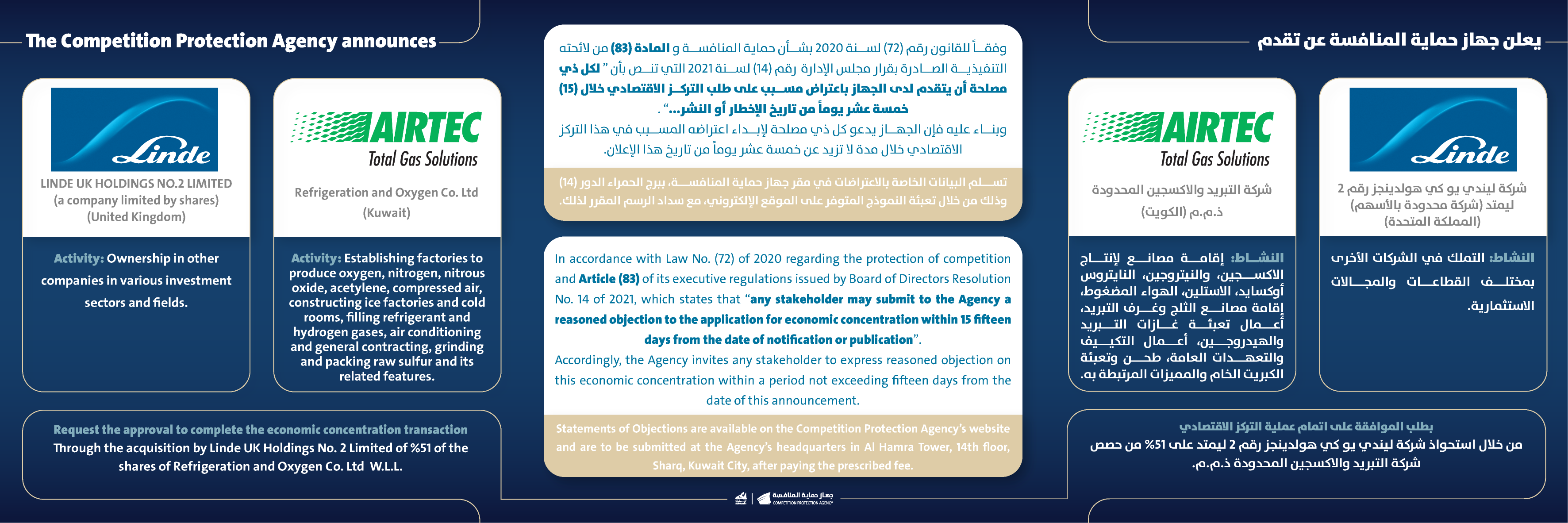 يعلن جهاز حماية المنافسة عن تقدم شركة حسام الخرافي للتجارة العامة والمقاولات ذ.م.م. وشركة