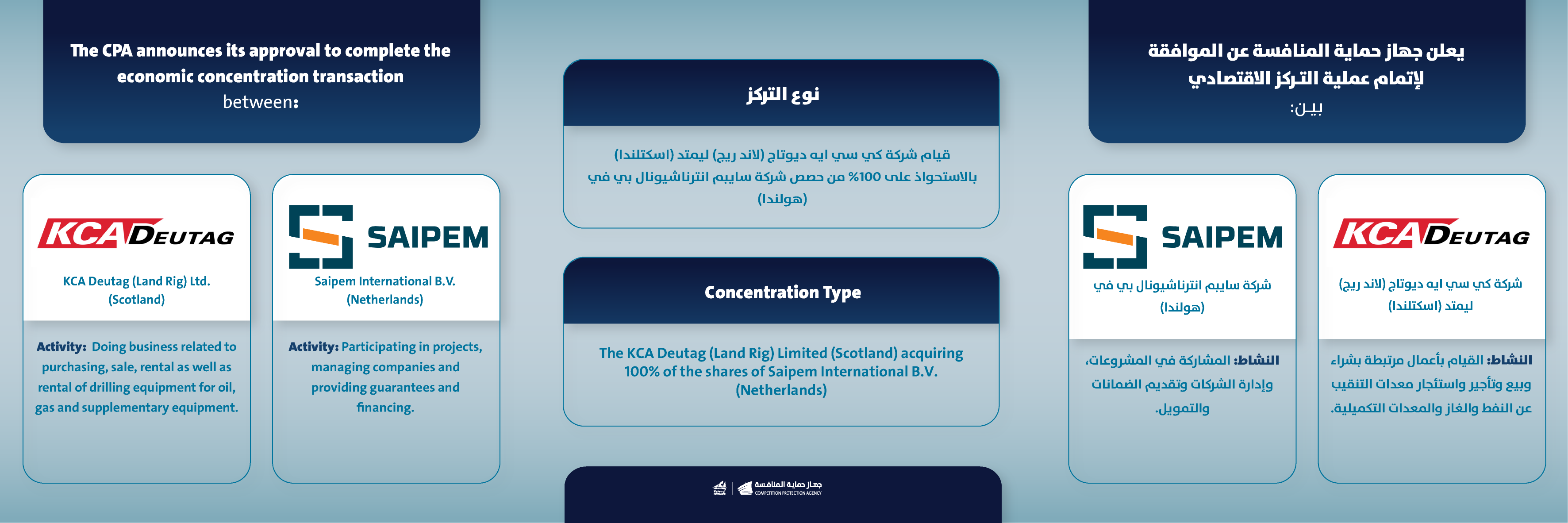 يعلن جهاز حماية المنافسة على الموافقة لإتمام عملية التركز الاقتصادي بين شركة كي سي ايه ديو