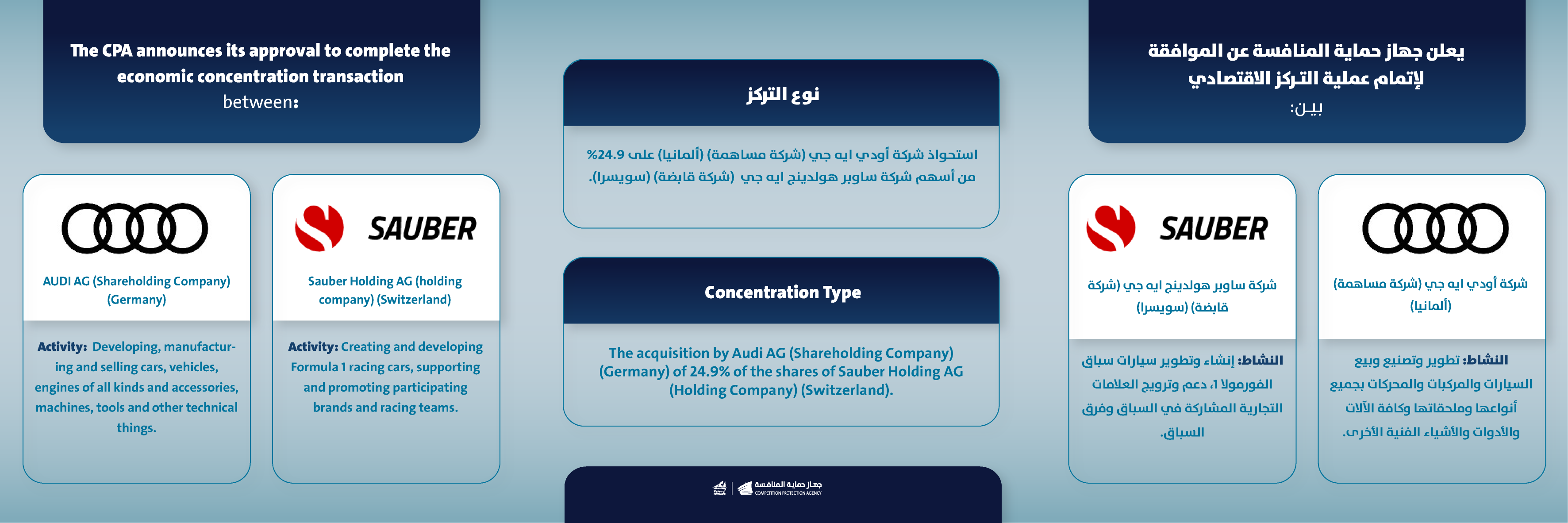 يعلن جهاز حماية المنافسة على الموافقة لإتمام عملية التركز الاقتصادي بين شركة أودي ايه جي (