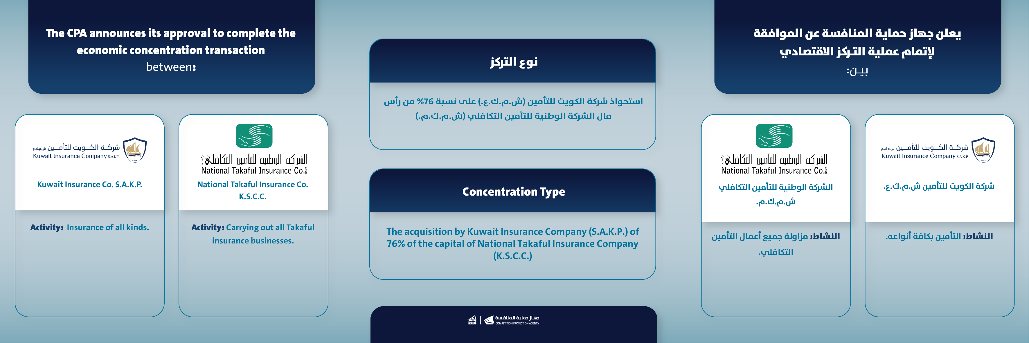 يعلن جهاز حماية المنافسة على الموافقة لإتمام عملية التركز الاقتصادي بين شركة الكويت للتأمي