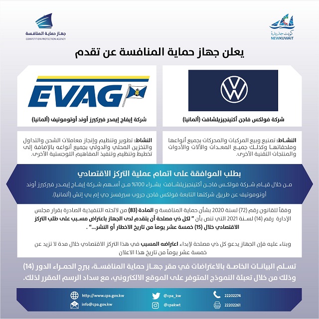 يعلن جهاز حماية المنافسة عن تقدم شركة فولكس فاجن أيه جي من شركتها التابعة "كارياد إس ايه "