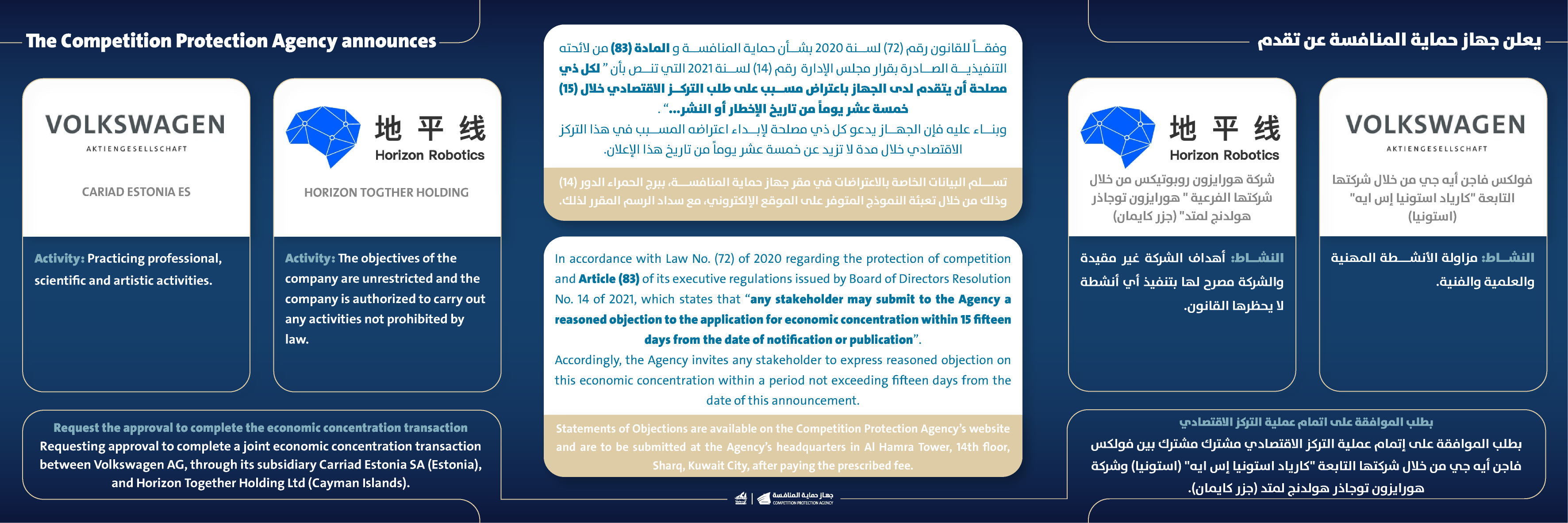 يعلن جهاز حماية المنافسة عن تقدم شركة فولكس فاجن أيه جي من شركتها التابعة "كارياد استونيا