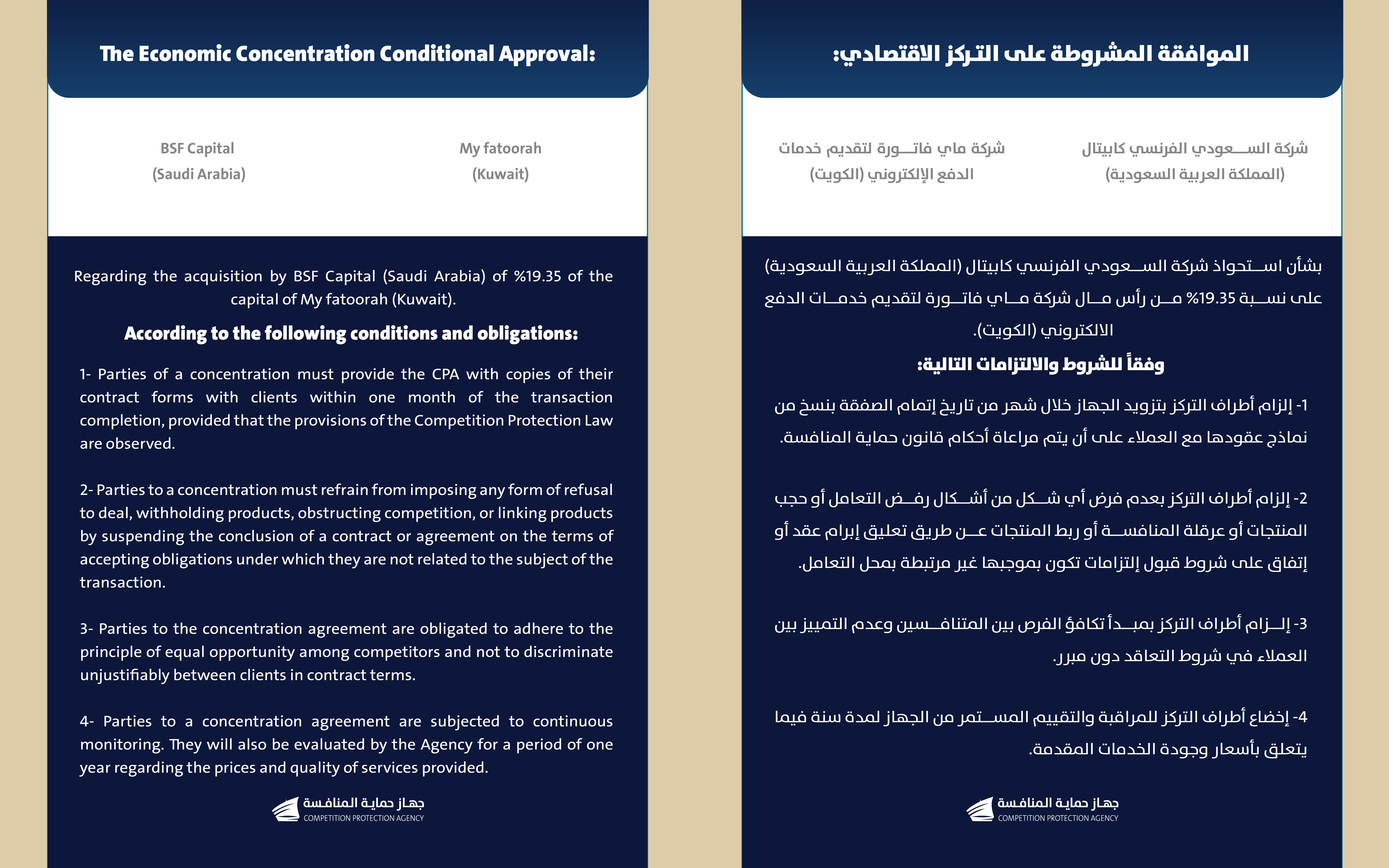 الموافقة المشروطة على عملية التركز الاقتصادي بين شركة السعودي الفرنسي كابيتال (المملكة الع