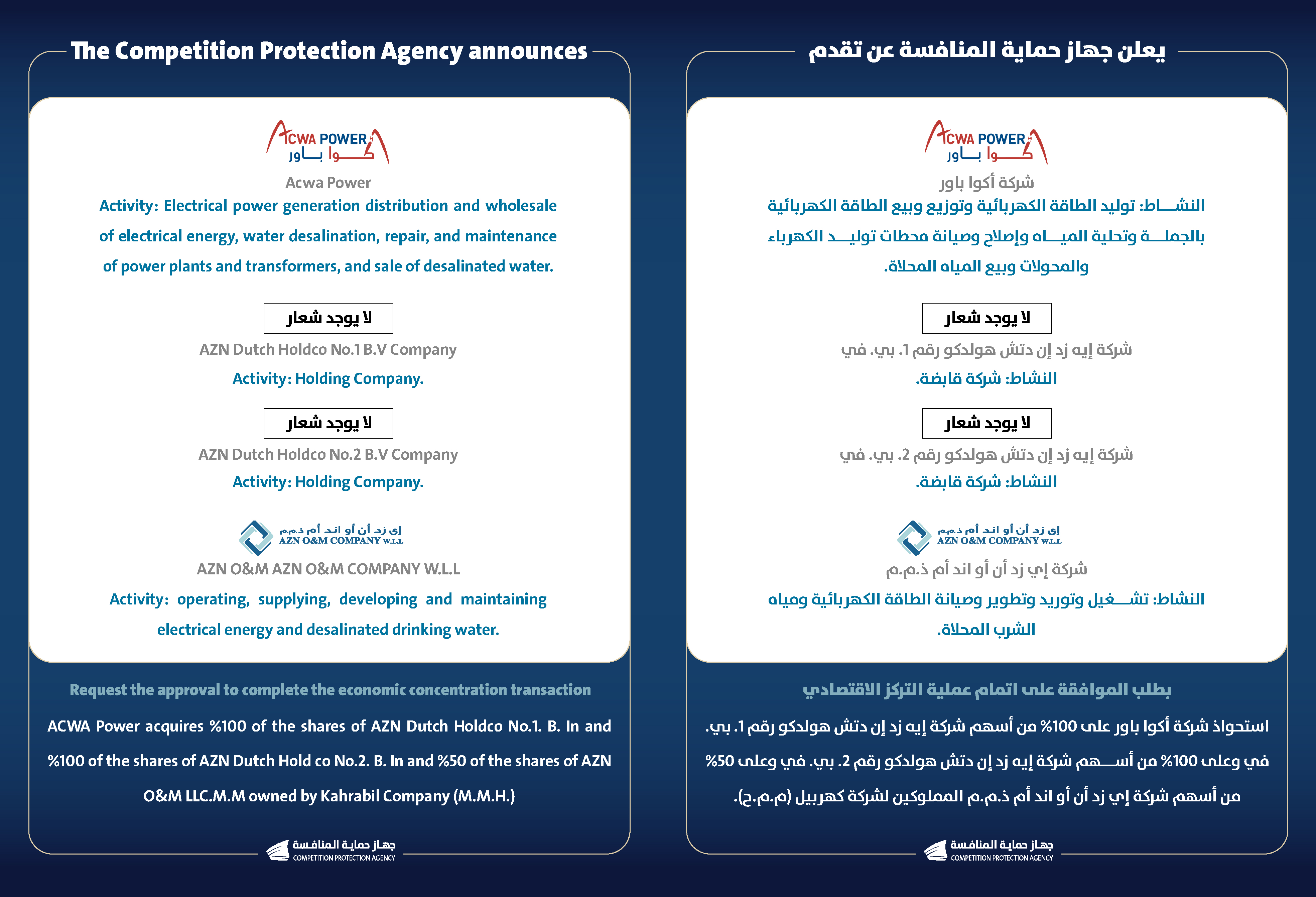 يعلن جهاز حماية المنافسة عن تقدم شركة أكوا باور وشركة إيه زد إن دتش هولدكو رقم 1.بي.في وشر
