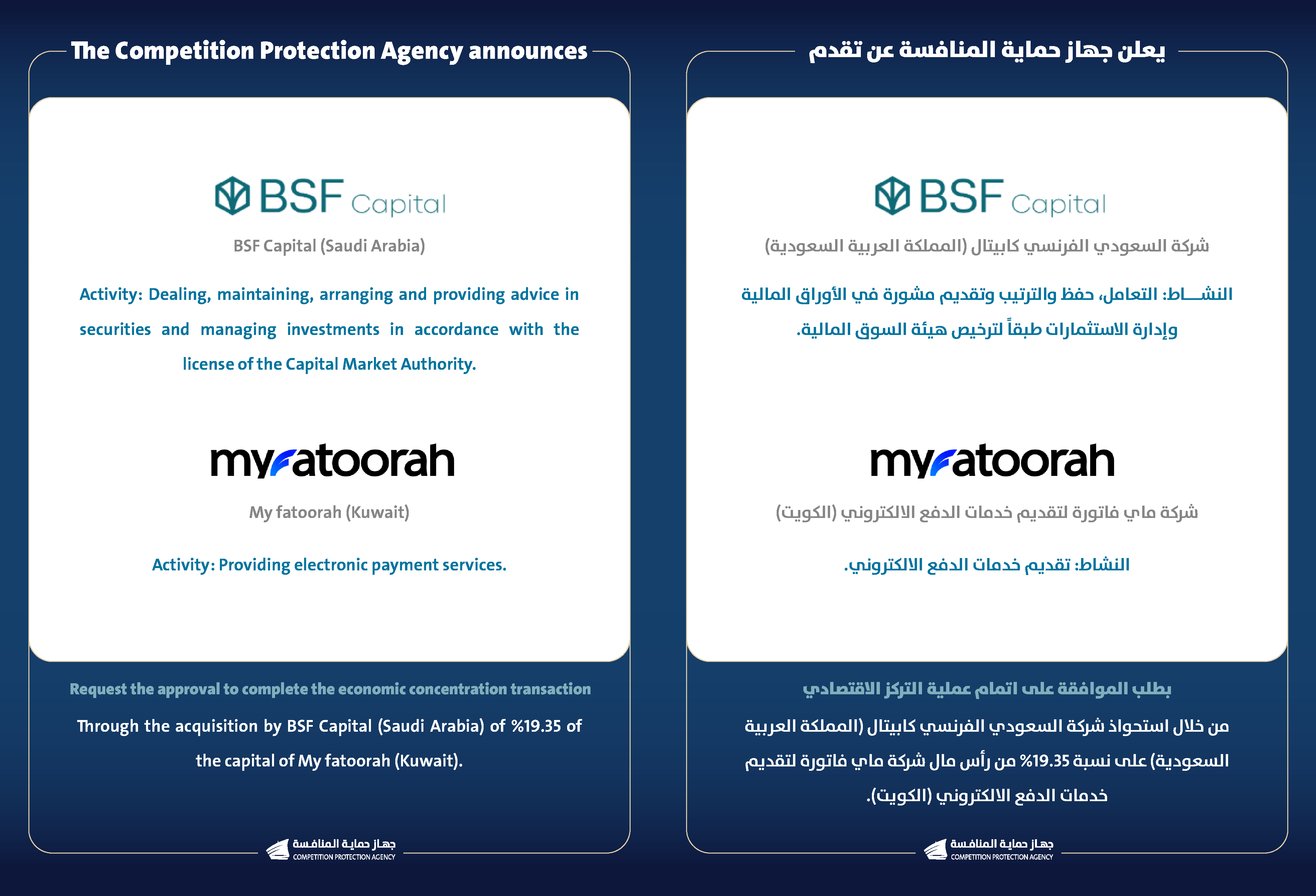 يعلن جهاز حماية المنافسة عن تقدم شركة السعودي الفرنسي كابيتال (المملكة العربية السعودية) و