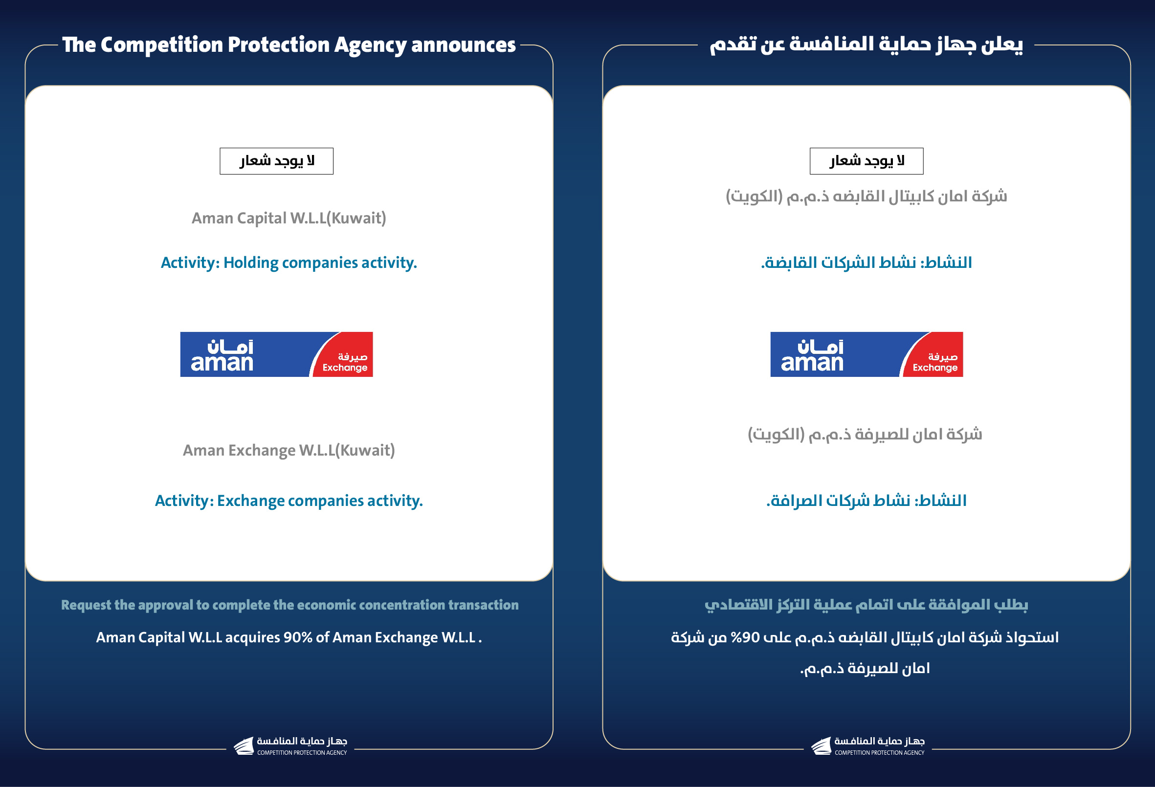 يعلن جهاز حماية المنافسة عن تقدم شركة امان كابيتال القابضة ذ.م.م (الكويت) وشركة امان للصير