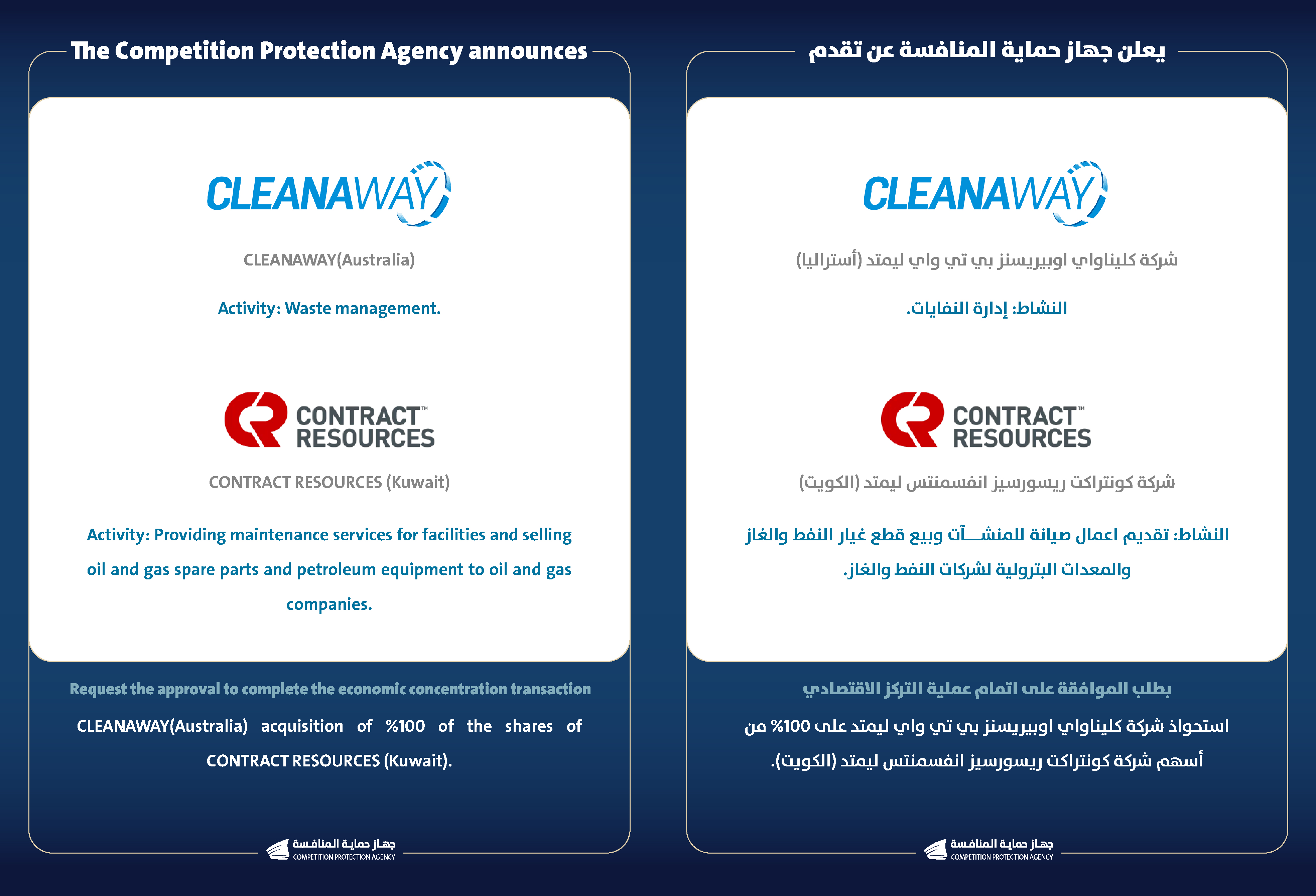 يعلن جهاز حماية المنافسة عن تقدم شركة شركة كليناواي اوبيريسنز بي تي واي ليمتد (أستراليا) و