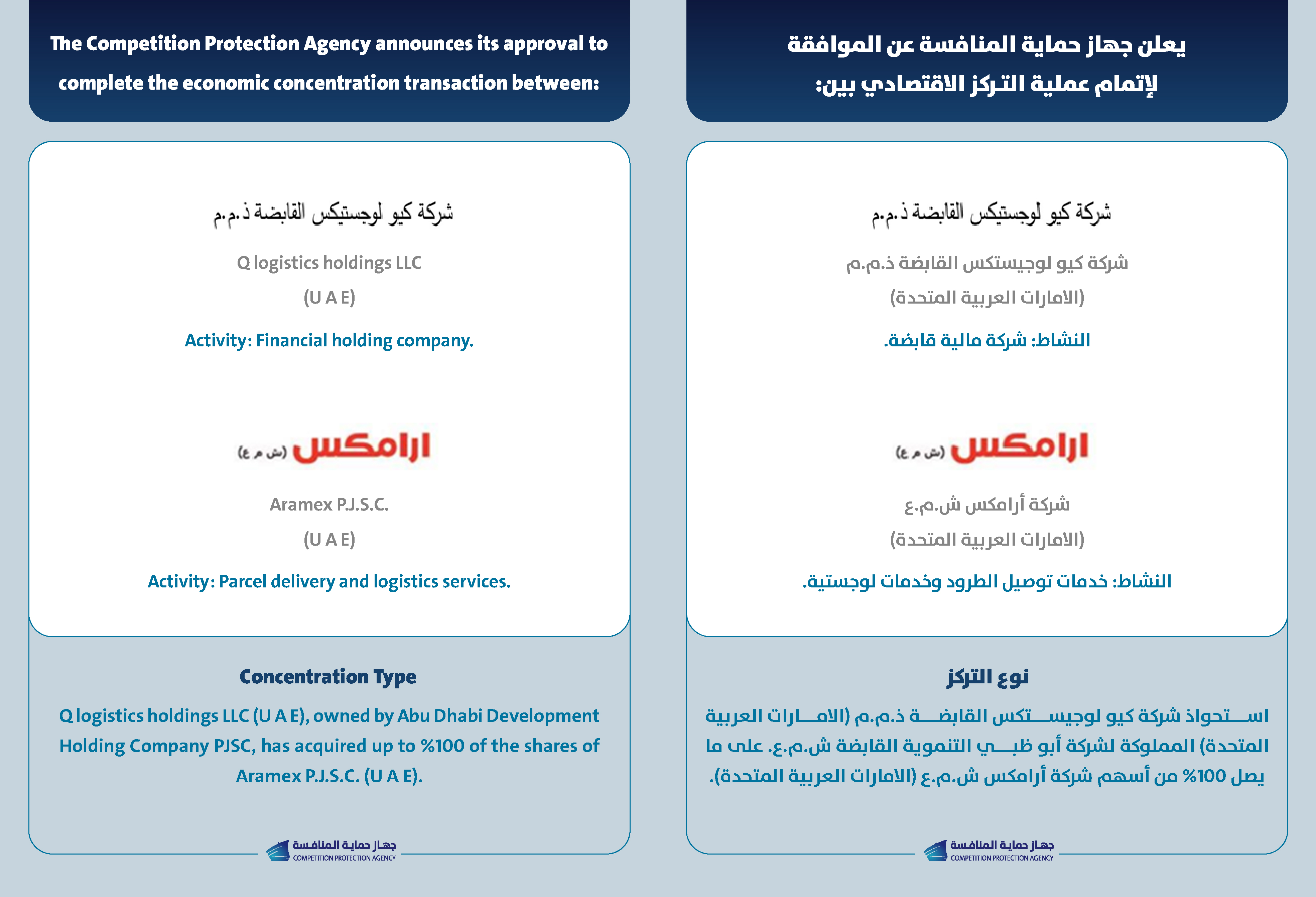 اعلان الموافقة لإتمام عملية التركز الاقتصادي بين شركة كيو لوجيستكس القابضة ذ.م.م (الامارات