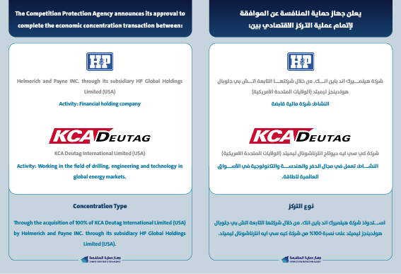 يعلن جهاز حماية المنافسة عن الموافقة لإتمام عملية التركز الاقتصادي بين شركة هيلميرك اند با