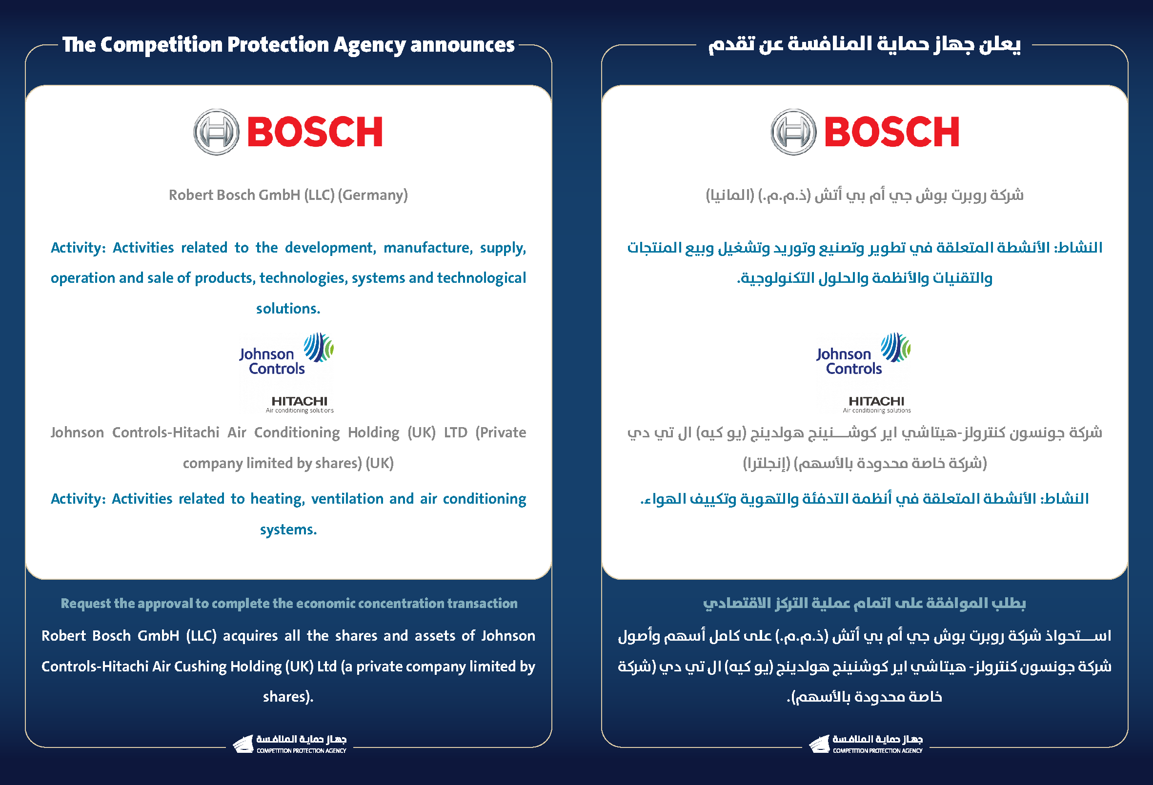 يعلن جهاز حماية المنافسة عن تقدم شركة روبرت بوش جي أم بي أتش(ذ.م.م)(المانيا) و شركة جونسو