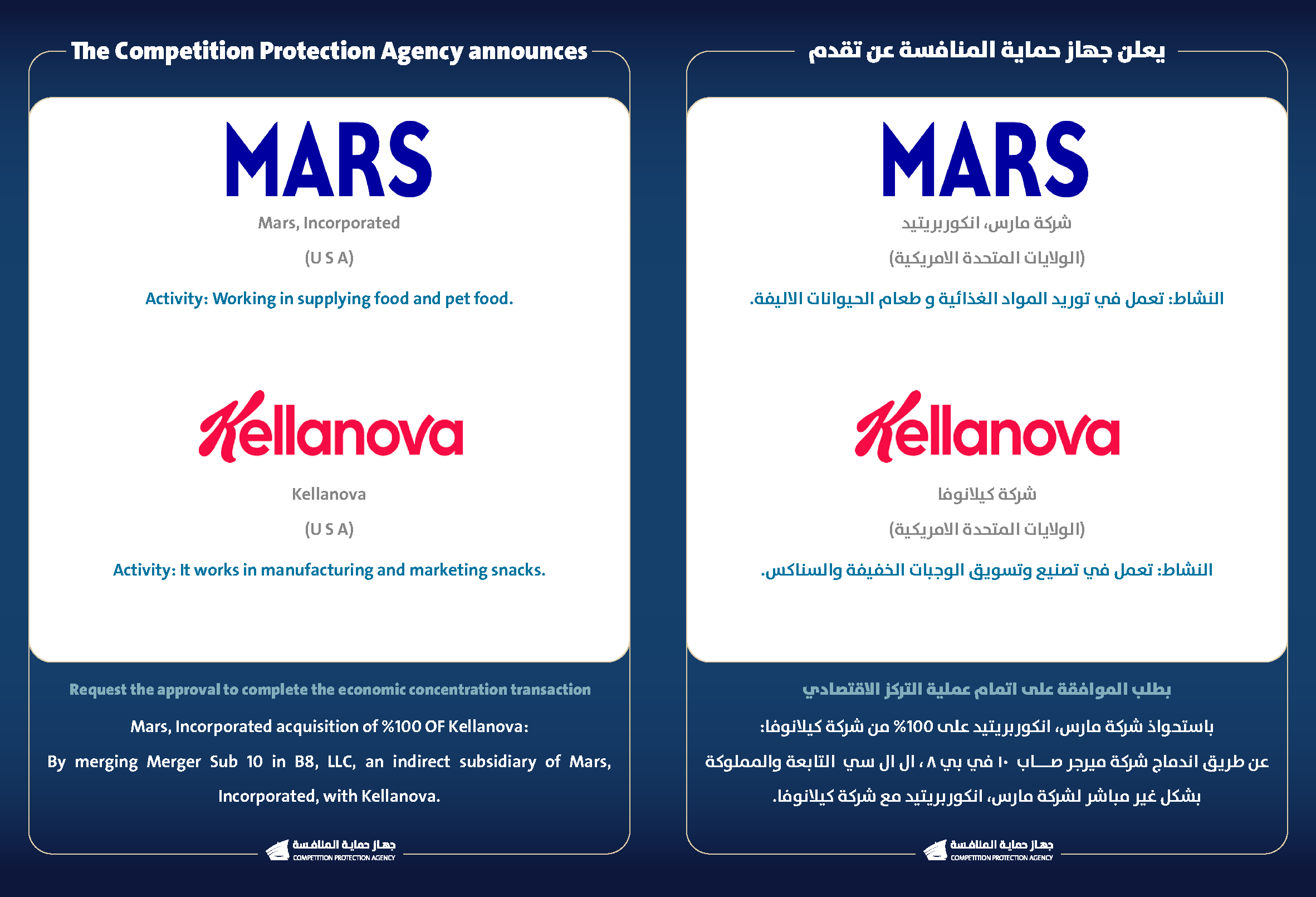 يعلن جهاز حماية المنافسة عن تقدم شركة مارس،انكوربريتيد (الولايات المتحدة الامريكية) وشركة
