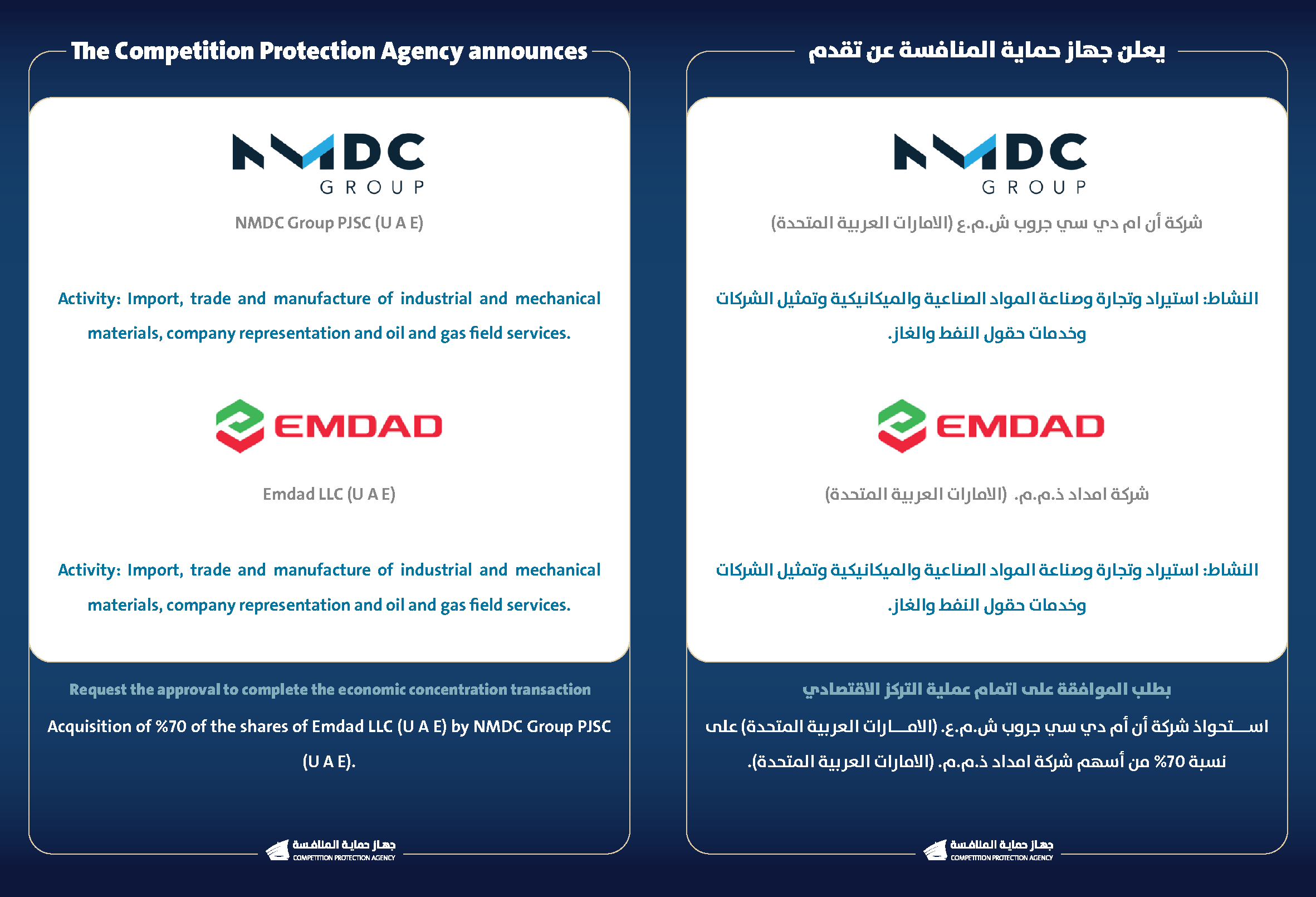 يعلن جهاز حماية المنافسة عن تقدم شركة أن ام دي سي جروب ش.م .ع (الامارات العربية المتحدة) و