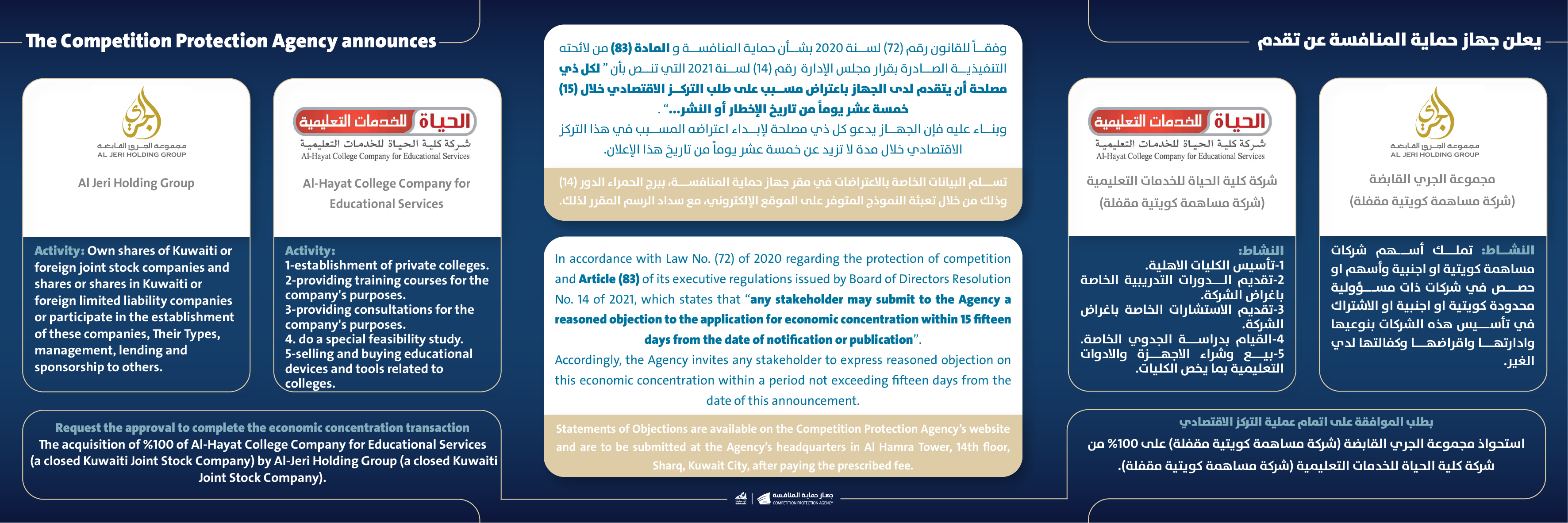 يعلن جهاز حماية المنافسة عن تقدم مجموعة الجري القابضة (شركة مساهمة كويتية مقفلة) وشركة كلية الحياة للخدمات التعليمية(شركة مساهمة كويتية مقفلة). بطلب الموافقة على اتمام عملية التركز الاقتصادي