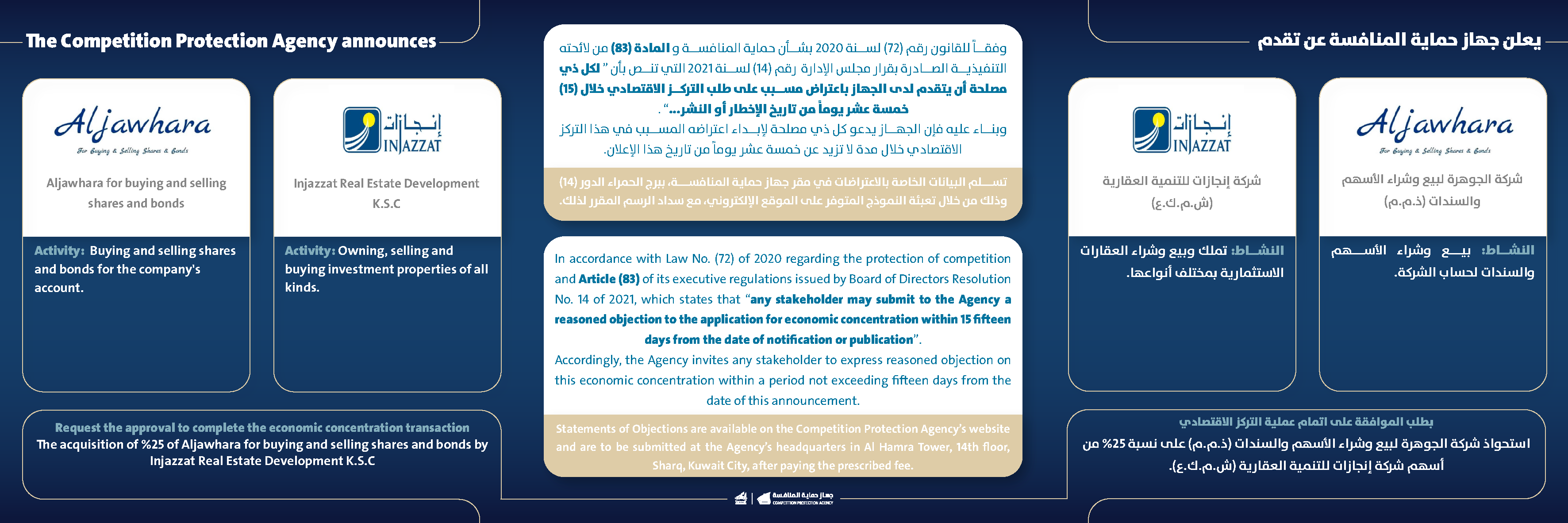 يعلن جهاز حماية المنافسة عن تقدم شركة الجوهرة لبيع وشراء الأسهم والسندات (ذم.م) و شركة إنجازات للتنمية العقارية (ش.م.ك.ع) بطلب الموافقة على اتمام عملية التركز الاقتصادي