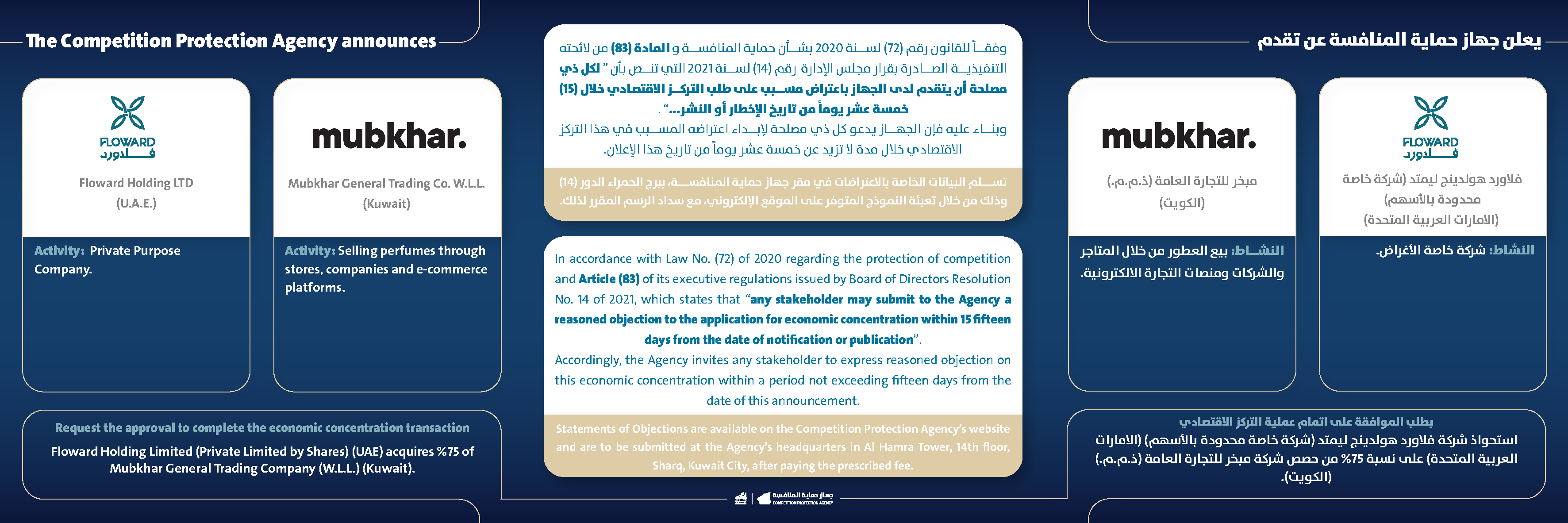 يعلن جهاز حماية المنافسة عن تقدم شركة فلاورد هولدينج ليمتد (شركة خاصة محدودة بالأسهم)( الأمارات العربية المتحدة) وشركة مبخر للتجارة العامة (ذ.م.م)(الكويت) بطلب الموافقة على اتمام عملية التركز الاقتصادي