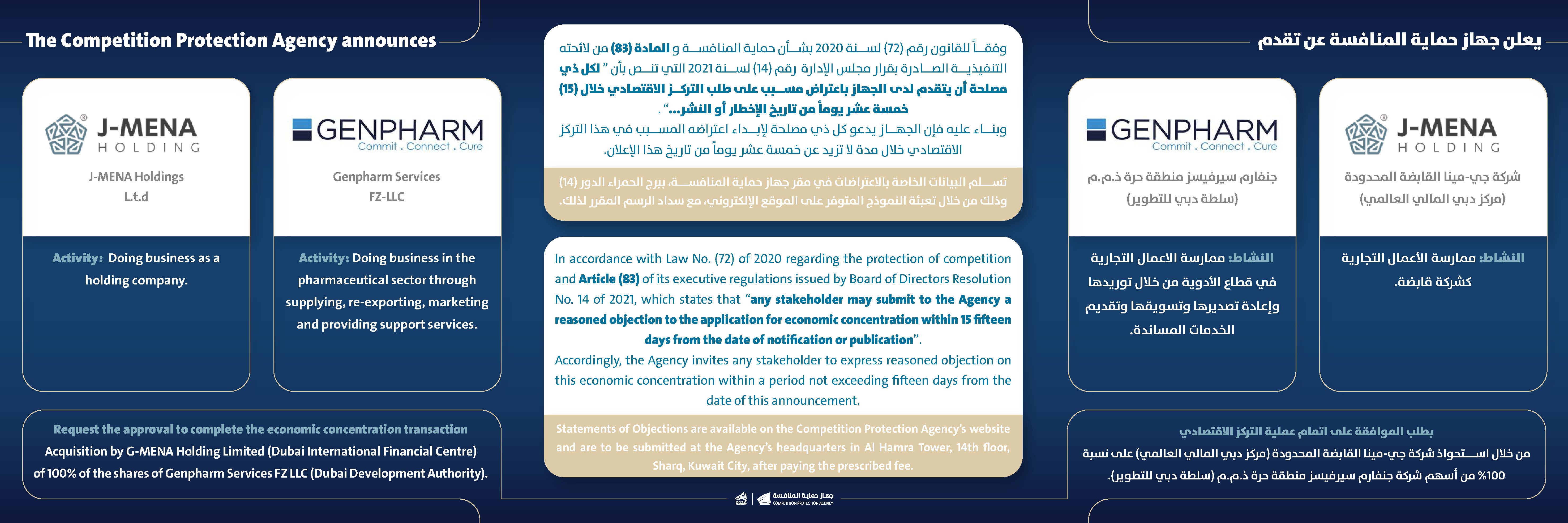 يعلن جهاز حماية المنافسة عن تقدم شركة جي -مينا القابضة المحدودة (مركز دبي المالي العالمي) وشركة جنفارم سيرفيسز منطقة حرة ذ.م.م (سلطة دبي للتطوير) بطلب الموافقة على اتمام عملية التركز الاقتصادي