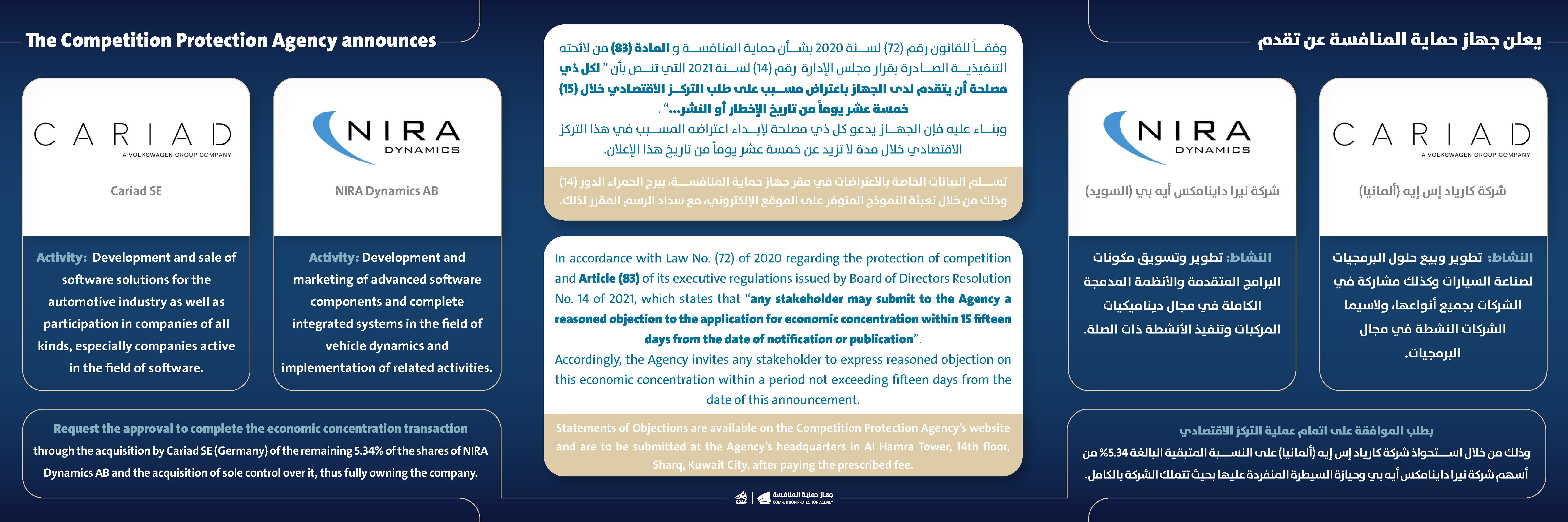 يعلن جهاز حماية المنافسة عن تقدم شركة كارياد إس إيه (ألمانيا) وشركة نيرا داينامكس أيه بي (السويد) بطلب الموافقة على اتمام عملية التركز الاقتصادي