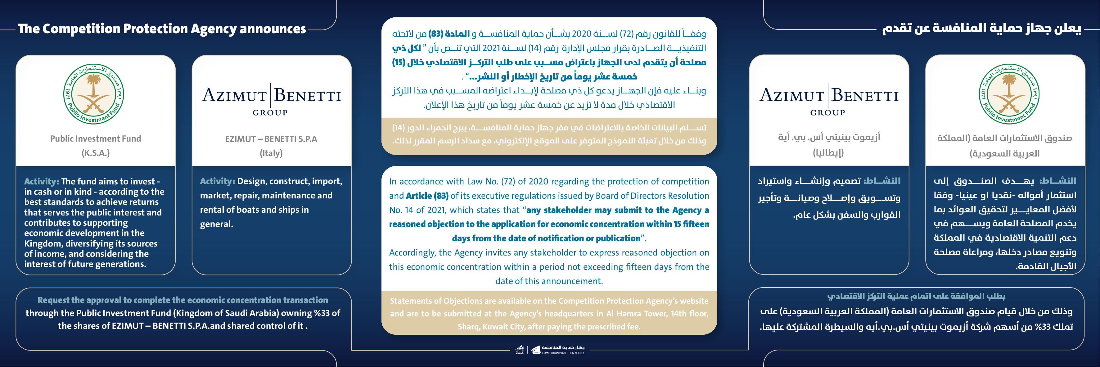 يعلن جهاز حماية المنافسة عن تقدم صندوق الاستثمارات العامة (المملكة العربية السعودية) وشركة أزيموت بينيتي أس .بي.أية (إيطاليا) بطلب الموافقة على اتمام عملية التركز الاقتصادي