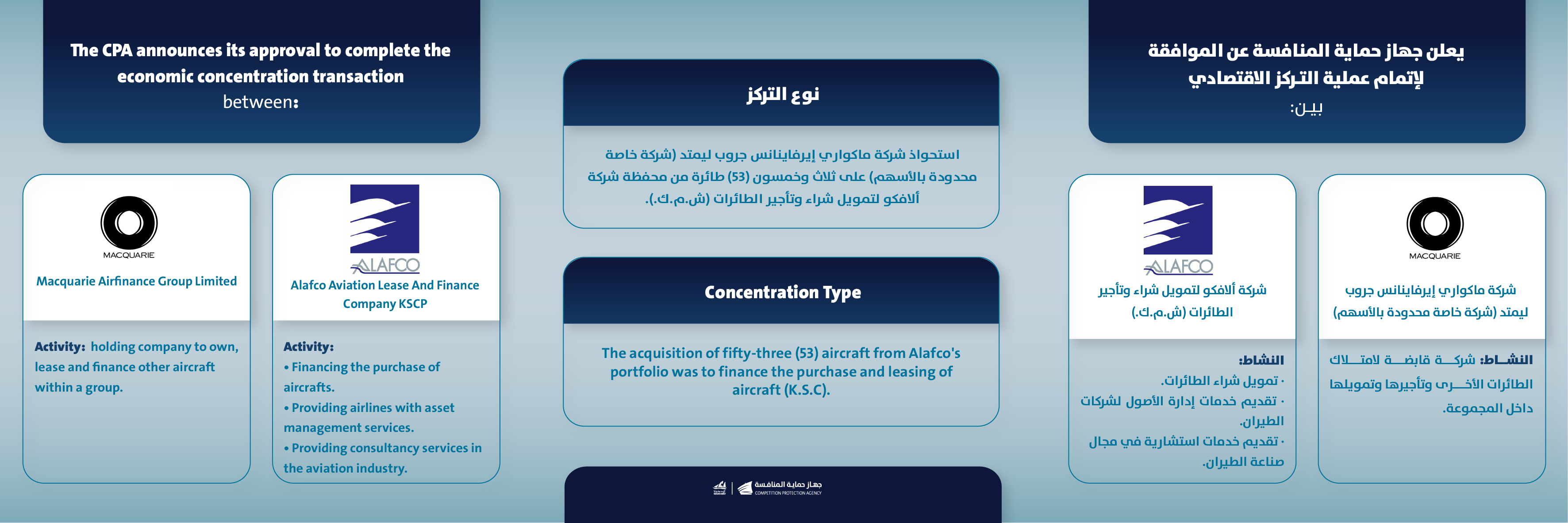 يعلن جهاز حماية المنافسة على الموافقة لإتمام عملية التركز الاقتصادي بين شركة ماكواري إيرفاينانس جروب ليمتد (شركة خاصة محدودة بالأسهم ) وشركة ألافكو لتمويل شراء وتأجيرالطائرات(ش.م.ك.)