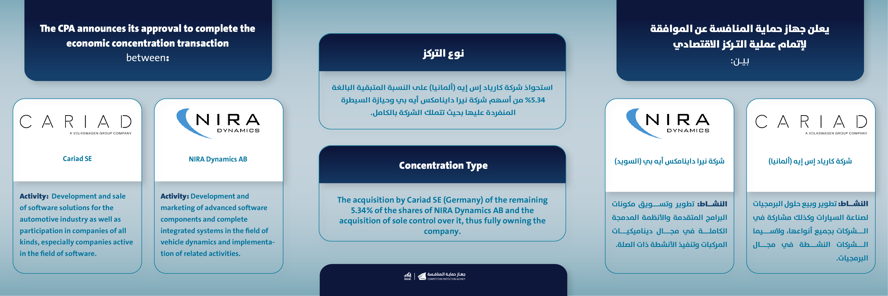 يعلن جهاز حماية المنافسة على الموافقة لإتمام عملية التركز الاقتصادي بين شركة كارياد إس إيه (ألمانيا). وشركة نيرا داينامكس أيه بي (السويد)