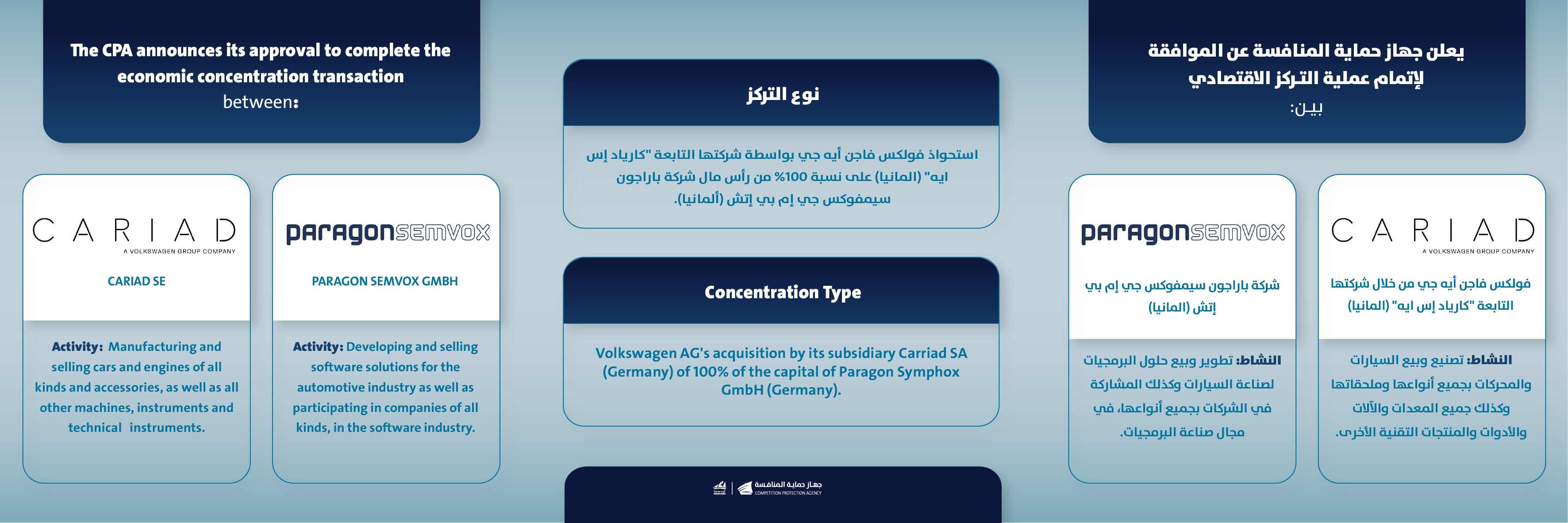 يعلن جهاز حماية المنافسة على الموافقة لإتمام عملية التركز الاقتصادي بين شركة فولكس فاجن أي جي من شركتها التابعة "كارياد إس ايه "(المانيا) وشركة باراجون سيمفوكس جي إم بي إتش(المانيا)