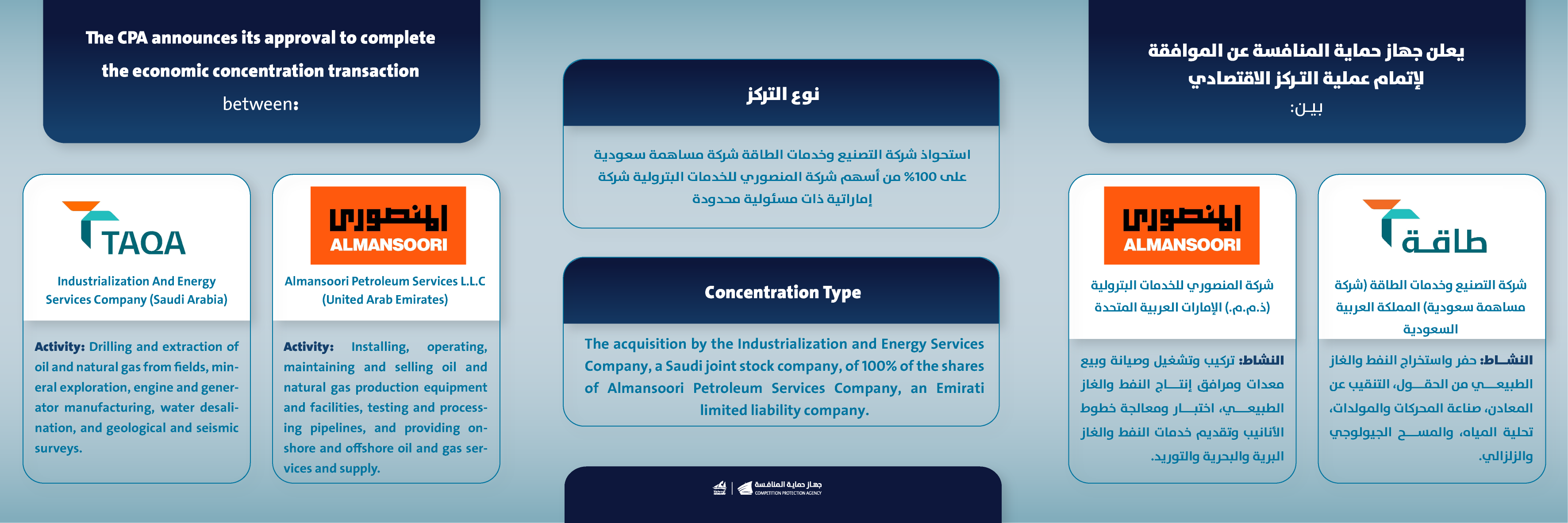 يعلن جهاز حماية المنافسة على الموافقة لإتمام عملية التركز الاقتصادي بين شركة التصنيع وخدمات الطاقة(شركة مساهمة سعودية)المملكة العربية السعودية و شركة المنصوري للخدمات البترولية(ذ.م.م.)الإمارات العربية المتحدة