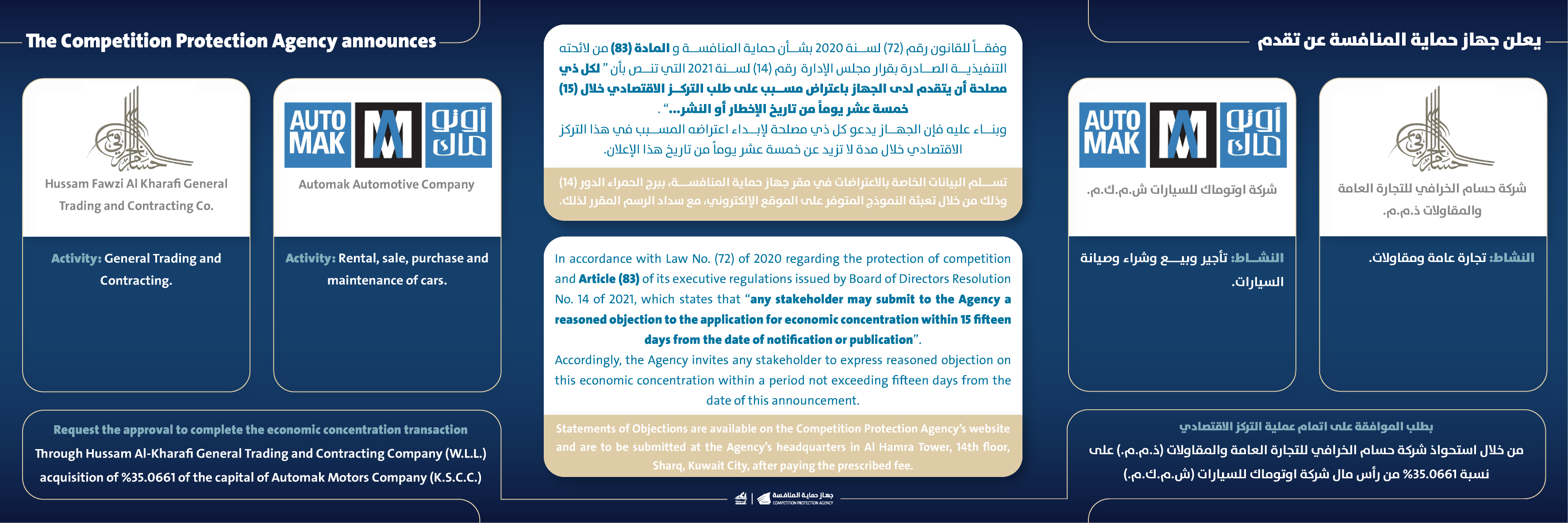 يعلن جهاز حماية المنافسة عن تقدم شركة حسام الخرافي للتجارة العامة والمقاولات ذ.م.م. وشركة اوتوماك للسيارات ش.م.ك.م. بطلب الموافقة على اتمام عملية التركز الاقتصادي