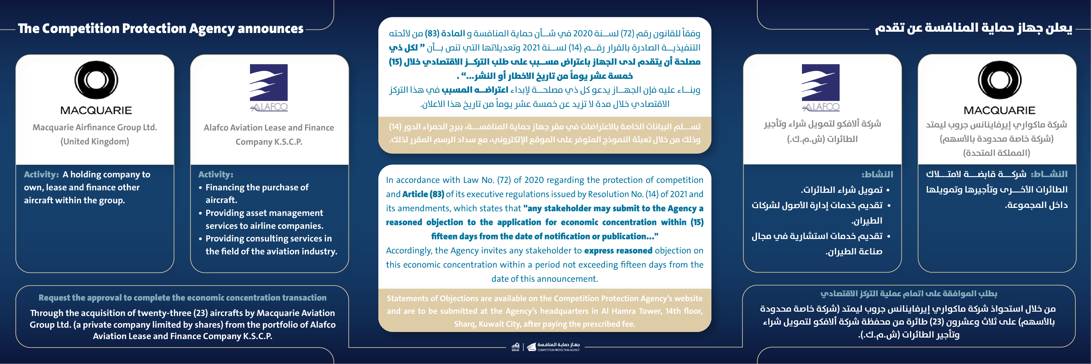 يعلن جهاز حماية المنافسة عن تقدم شركة ماكواري إيرفاينانس جروب ليمتد( شركة خاصة محدودة بالأسهم)(المملكة المتحدة) وشركة ألافكو لتمويل شراء وتأجير الطائرات (ش.م.ك.) بطلب الموافقة على اتمام عملية التركز الاقتصادي
