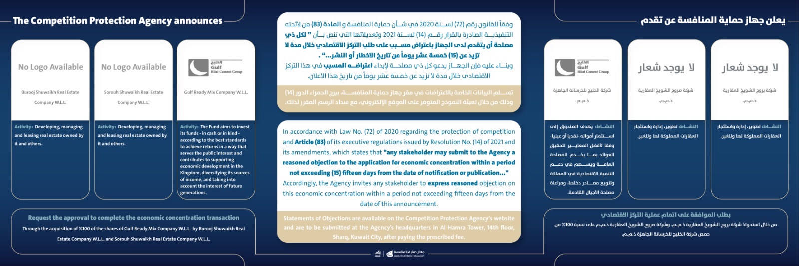 يعلن جهاز حماية المنافسة عن تقدم شركة بروج الشويخ العقارية ذ.م.م وشركة صروح الشويخ العقارية ذ.م.م وشركة الخليج للخرسانة الجاهزة ذ.م.م بطلب الموافقة على اتمام عملية التركز الاقتصادي.