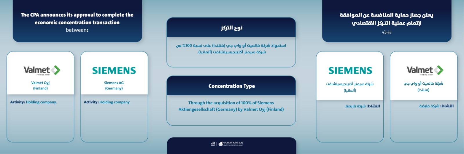 يعلن جهاز حماية المنافسة عن الموافقة لإتمام عملية التركز الاقتصادي بين شركة فالميت أو واي جي(فنلندا) وشركة سيمنز أكتينجيسيلشافت(المانيا)