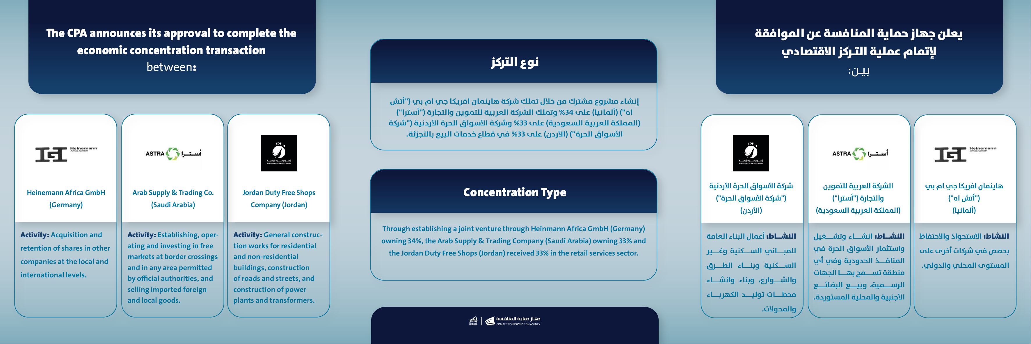 يعلن جهاز حماية المنافسة عن الموافقة لإتمام عملية التركز الاقتصادي بين هاينمان أفريكا جي ام بي ("اتش اه")(ألمانيا) والشركة العربية للتموين والتجارة("أسترا")(المملكة العربية السعودية) وشركة الأسواق الحرة الأردنية("شركة الأسواق الحرة")(الأردن)