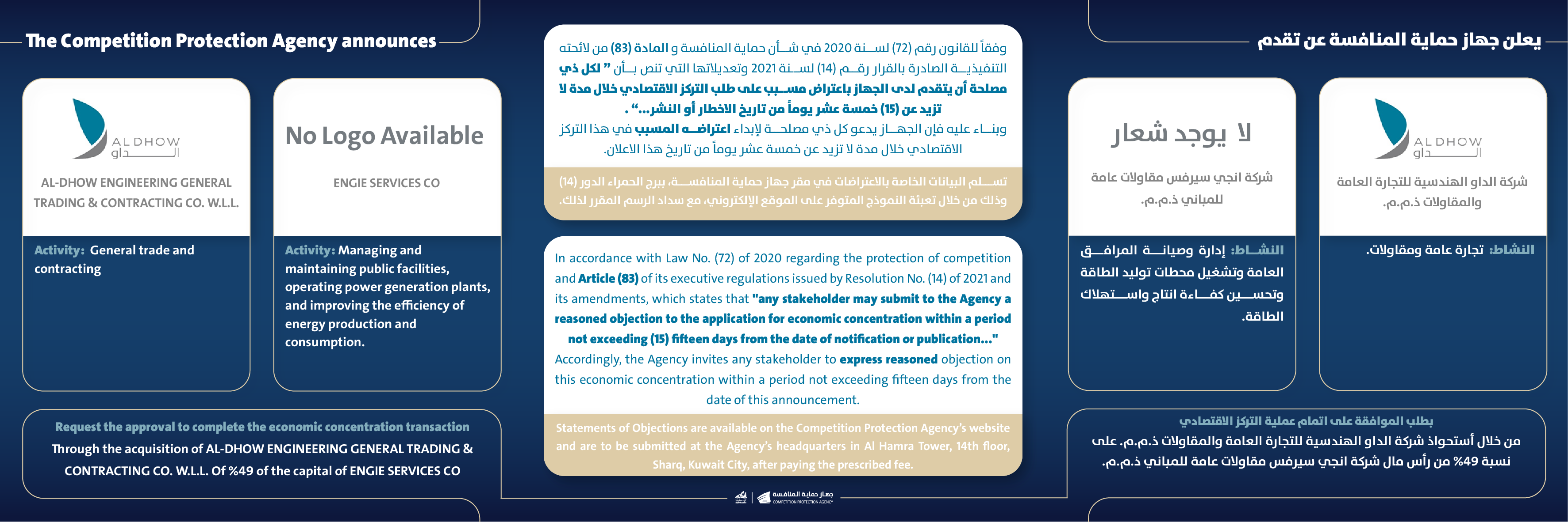 يعلن جهاز حماية المنافسة عن تقدم شركة الداو الهندسية للتجارة العامة والمقاولات ذ.م م وشركة انجي سيرفس مقاولات عامة للمباني ذ.م.م بطلب الموافقة على اتمام عملية التركز الاقتصادي.