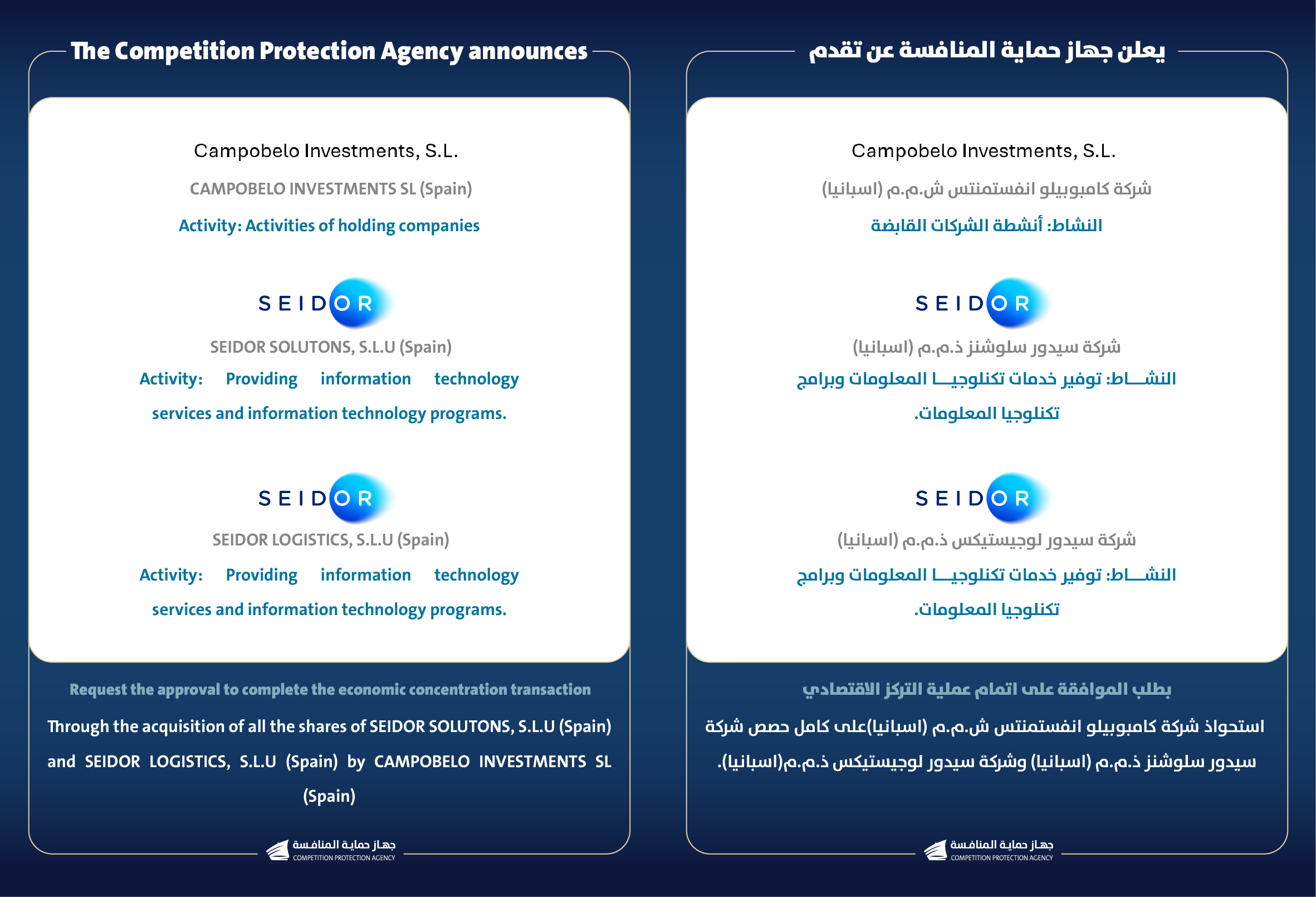 يعلن جهاز حماية المنافسة عن تقدم شركة كامبوبيلو انفستمنتس ش.م.م (اسبانيا) وشركة سيدور سلوشنز ذ.م.م (اسبانيا) وشركة سيدور لوجيستيكس ذ.م.م(اسبانيا) بطلب الموافقة على اتمام عملية التركز الاقتصادي