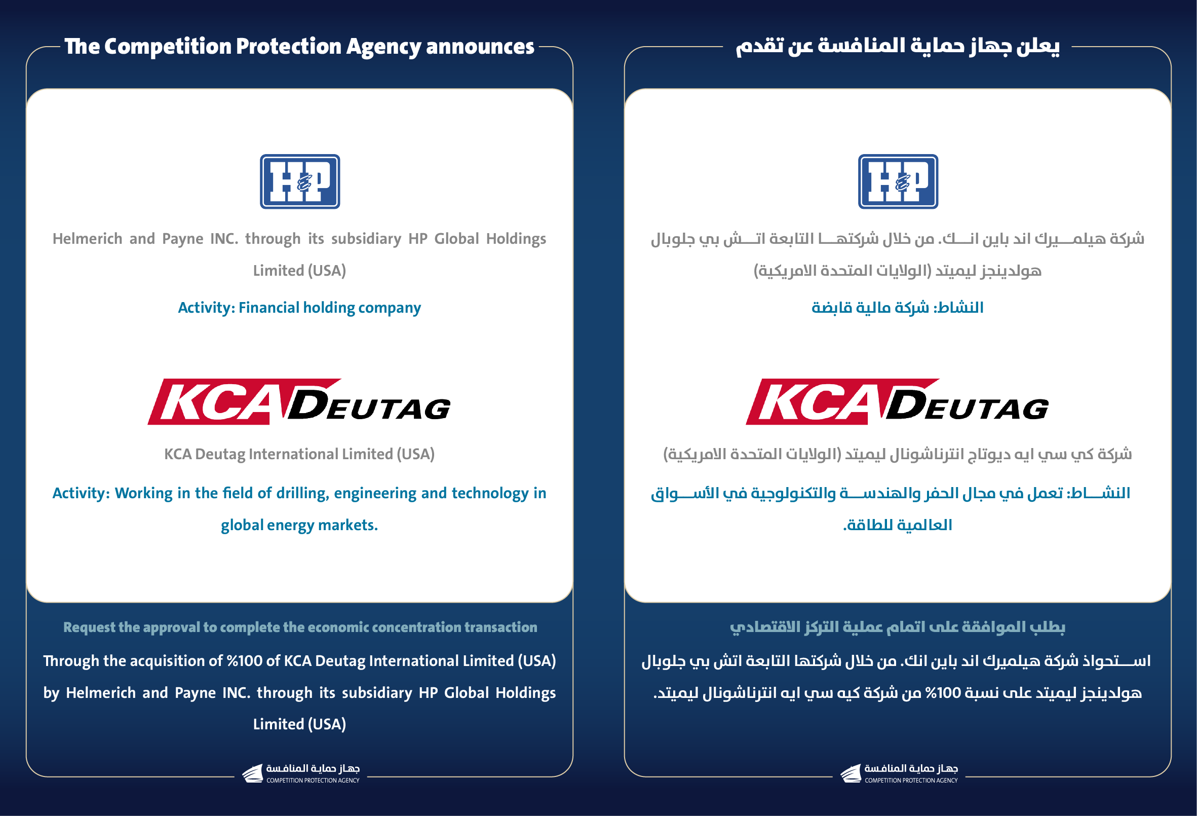 يعلن جهاز حماية المنافسة عن تقدم شركة هيلميرك اند باين انك. من خلال شركتها التابعة اتش بي جلوبال هولدينجز ليميتد (الولايات المتحدة الامريكية) وشركة كي سي ايه ديوتاج انترناشونال ليميتد (الولايات المتحدة الامريكية) بطلب الموافقة على اتمام عملية التركز الاقتصادي.