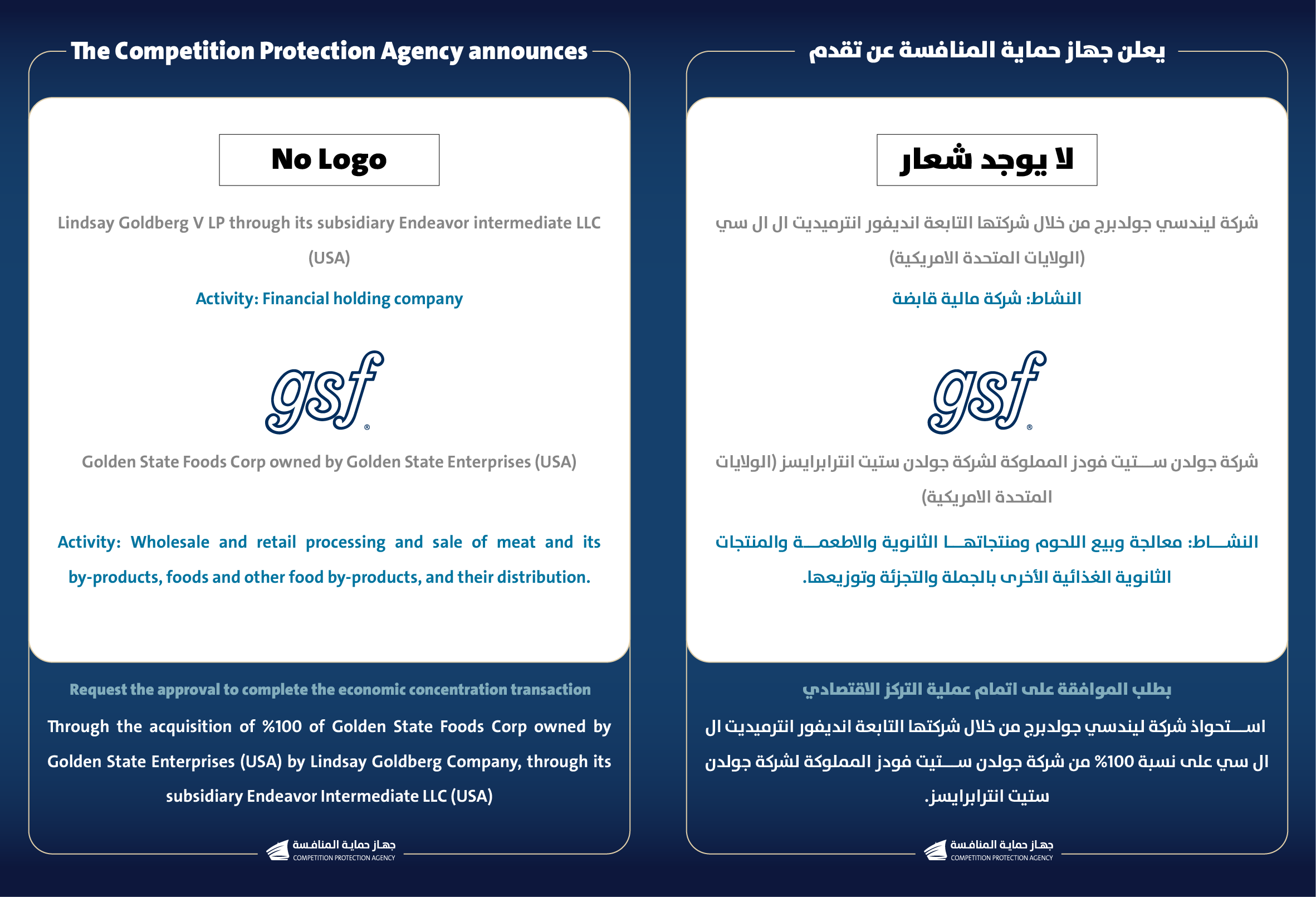 يعلن جهاز حماية المنافسة عن تقدم شركة ليندسي جولدبرج من خلال شركتها التابعة انديفور انترميديت ال ال سي (الولايات المتحدة الامريكية) وشركة جولدن ستيت فودز المملوكة لشركة جولدن ستيت انترابرايسز (الولايات المتحدة الامريكية) بطلب الموافقة على اتمام عملية التركز الاقتصادي