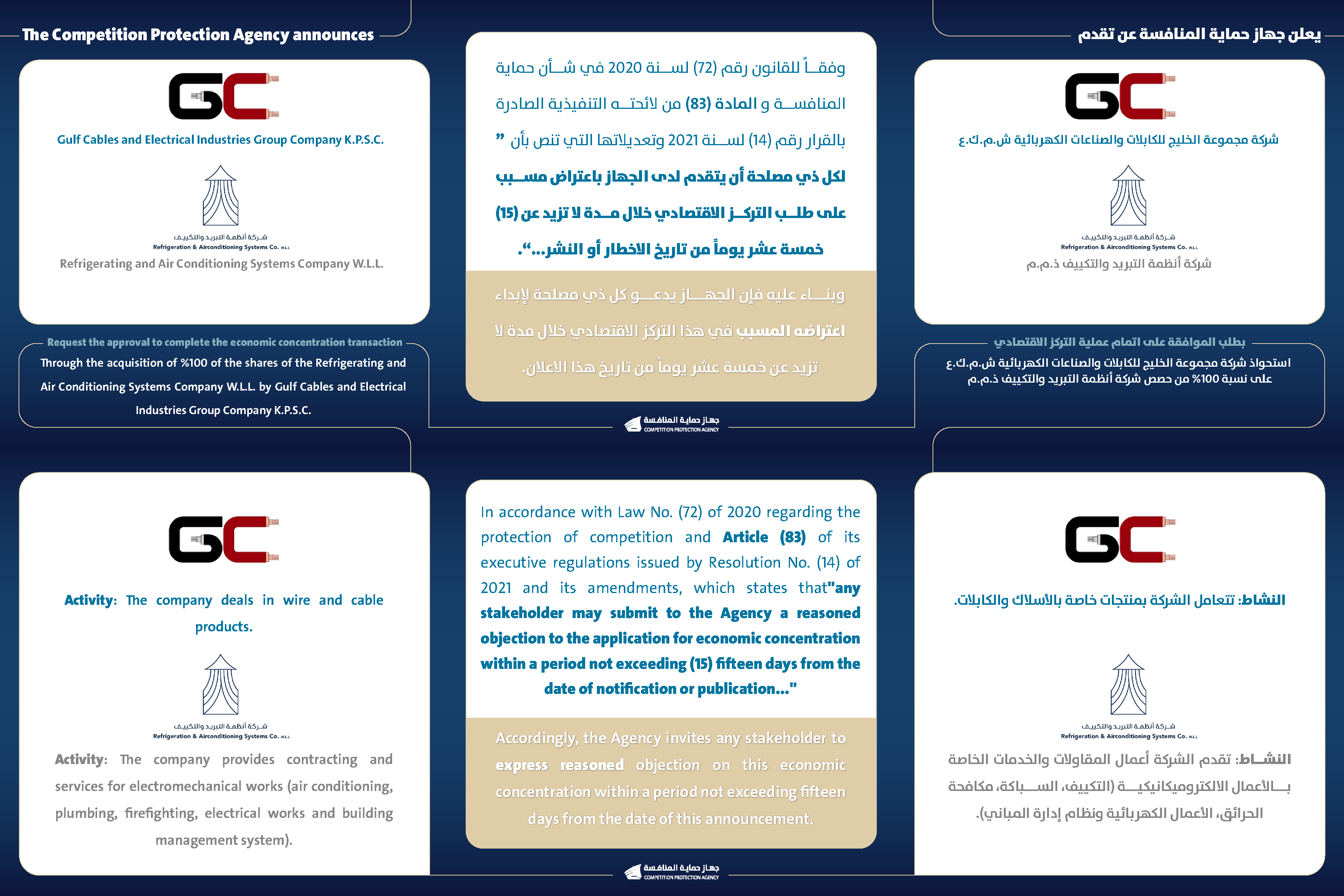 يعلن جهاز حماية المنافسة عن تقدم شركة مجموعة الخليج للكابلات والصناعات الكهربائية ش.م.ك.ع وشركة أنظمة التبريد والتكييف ذ.م.م بطلب الموافقة على اتمام عملية التركز الاقتصادي