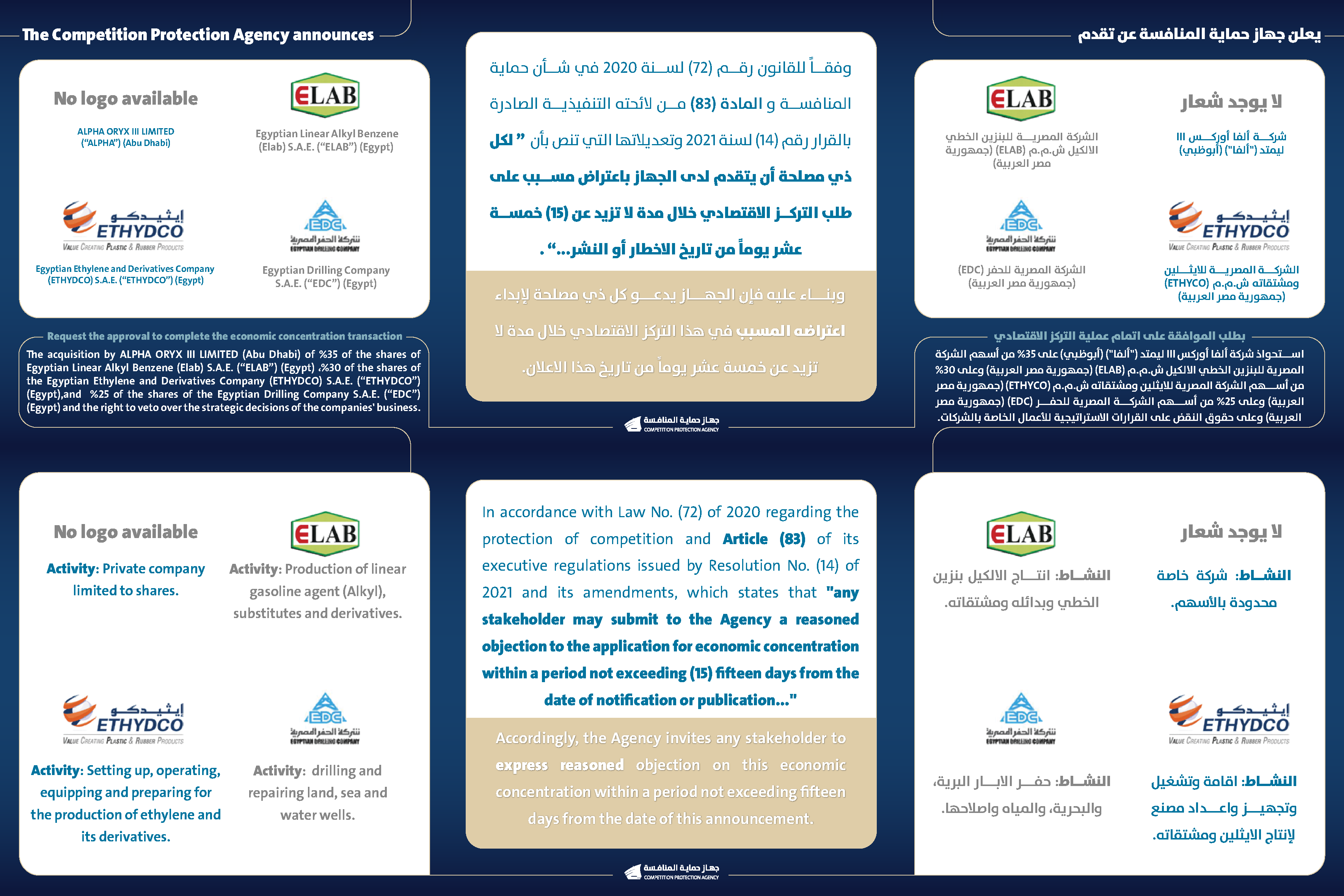 يعلن جهاز حماية المنافسة عن تقدم شركة ألفا أوركس III ليمتد ("ألفا") (أبوظبي) و الشركة المصرية للبنزين الخطي الالكيل ش.م.م (ELAB) (جمهورية مصر العربية) و الشركة المصرية للايثلين ومشتقاته ش.م.م (ETHYCO) (جمهورية مصر العربية) والشركة المصرية للحفر (EDC) (جمهورية مصر العربية بطلب الموافقة على اتمام عملية التركز الاقتصادي.