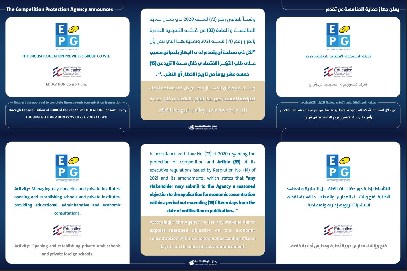 يعلن جهاز حماية المنافسة عن تقدم شركة المجموعة الإنجليزية التعليمية ذ.م.م و شركة كنسورتيوم التعليمية ش .ش.و بطلب الموافقة على اتمام عملية التركز الاقتصادي.