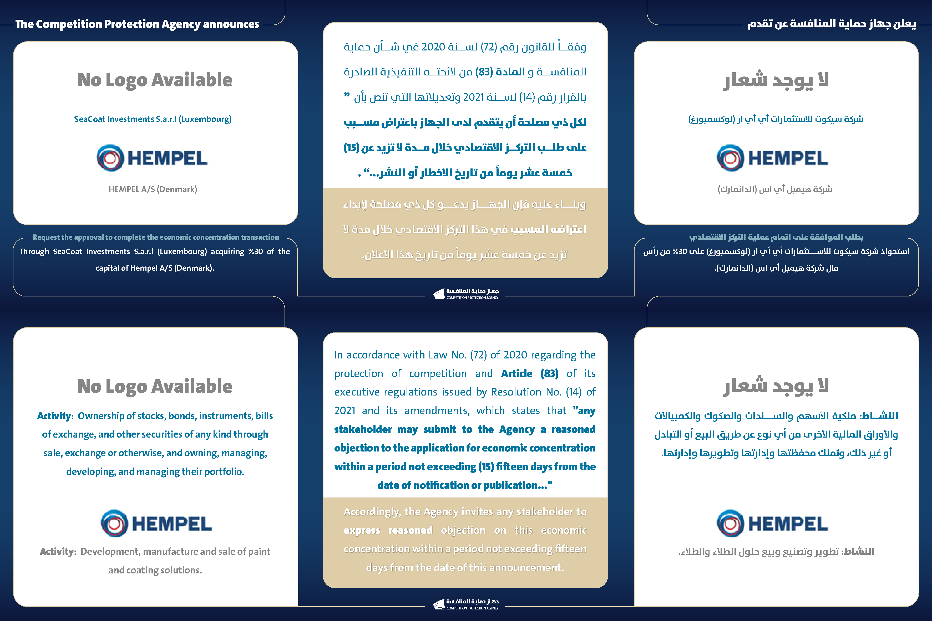 يعلن جهاز حماية المنافسة عن تقدم شركة سيكوت للاستثمارات أي أي ار(لوكسمبورغ ) و شركة هيمبل أي اس (الدنمارك) بطلب الموافقة على اتمام عملية التركز الاقتصادي.