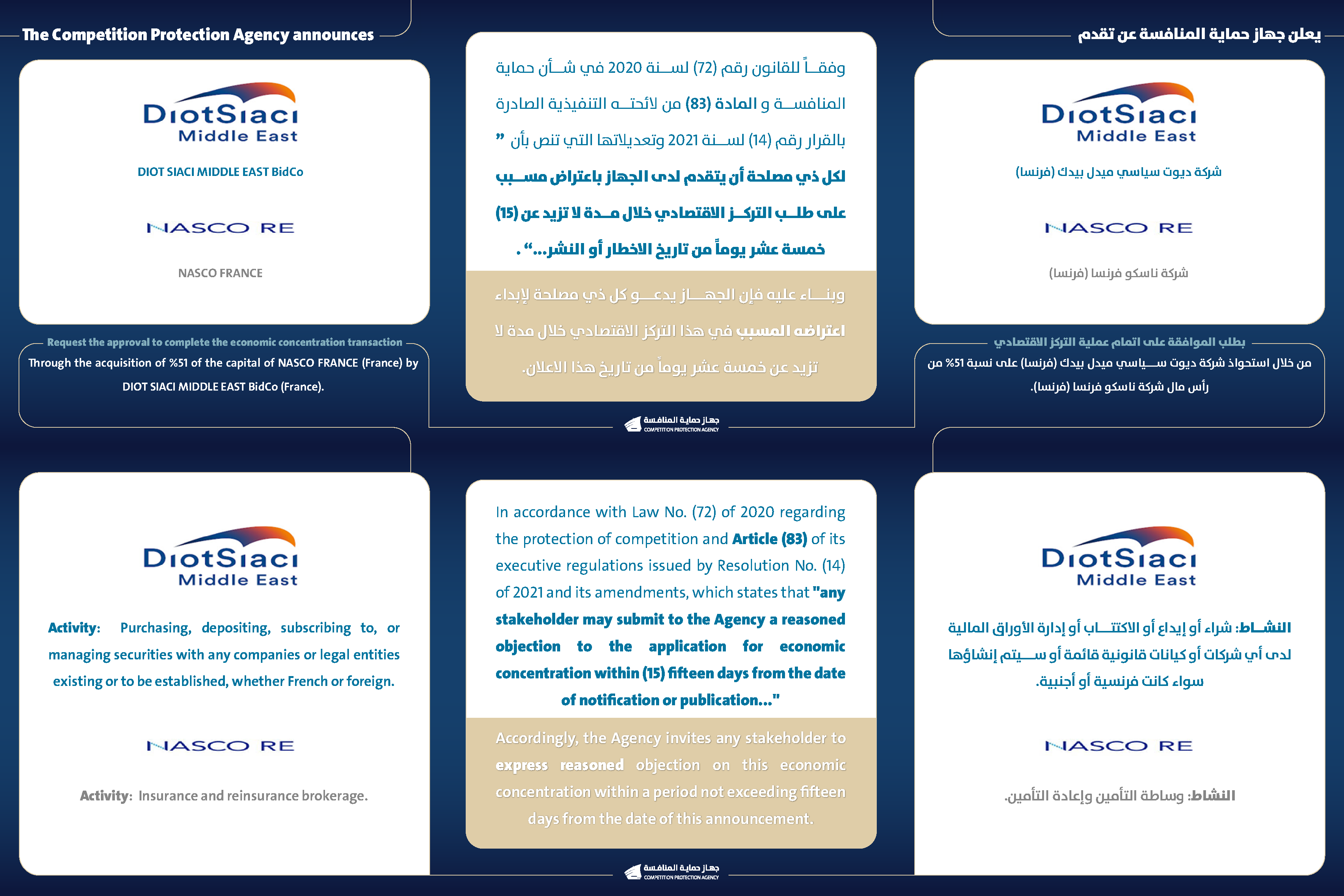 يعلن جهاز حماية المنافسة عن تقدم شركة ديوت سياسي ميدل بيدك (فرنسا) وشركة ناسكو فرنسا (فرنسا)بطلب الموافقة على اتمام عملية التركز الاقتصادي.