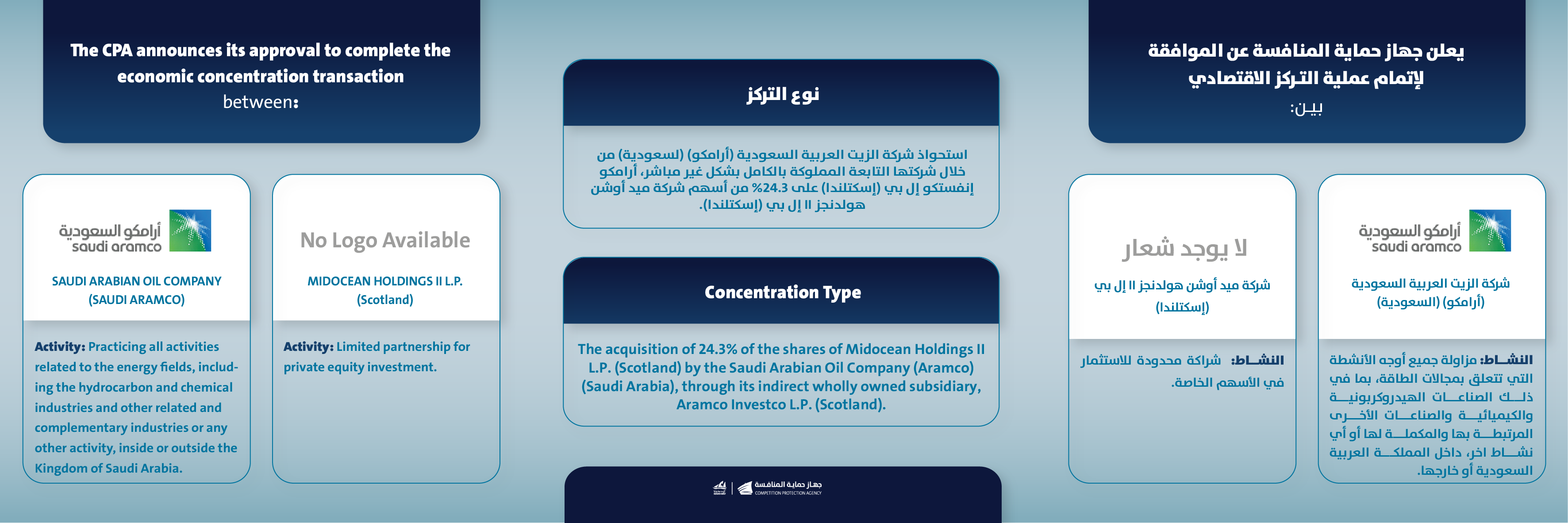 يعلن جهاز حماية المنافسة عن الموافقة لإتمام عملية التركز الاقتصادي بين شركة الزيت العربية السعودية ( أرامكو) ( السعودية) وشركة ميد أوشن هولدنجز 11أل بي ( إسكتلندا)